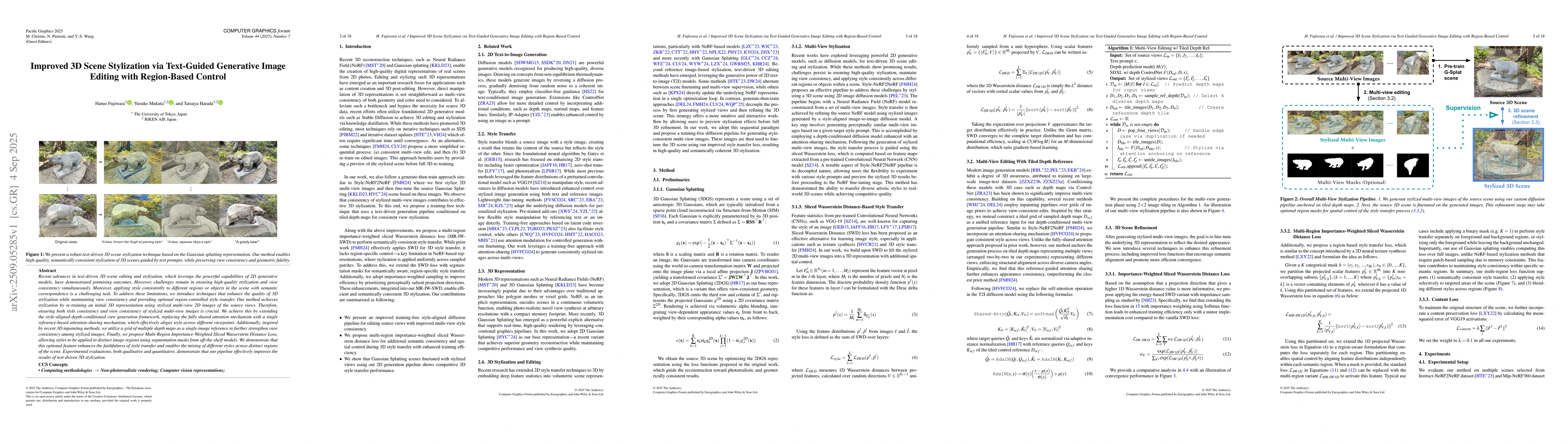 Recent advances in text-driven 3D scene editing and stylization, which leverage the powerful capabilities of 2D generative models, have demonstrated promising outcomes. However, challenges remain in ensuring high-quality stylization and view consistency simultaneously. Moreover, applying style consistently to different regions or objects in the scene with semantic correspondence is a challenging task. To address these limitations, we introduce techniques that enhance the quality of 3D stylization while maintaining view consistency and providing optional region-controlled style transfer. Our method achieves stylization by re-training an initial 3D representation using stylized multi-view 2D images of the source views. Therefore, ensuring both style consistency and view consistency of stylized multi-view images is crucial. We achieve this by extending the style-aligned depth-conditioned view generation framework, replacing the fully shared attention mechanism with a single reference-based attention-sharing mechanism, which effectively aligns style across different viewpoints. Additionally, inspired by recent 3D inpainting methods, we utilize a grid of multiple depth maps as a single-image reference to further strengthen view consistency among stylized images. Finally, we propose Multi-Region Importance-Weighted Sliced Wasserstein Distance Loss, allowing styles to be applied to distinct image regions using segmentation masks from off-the-shelf models. We demonstrate that this optional feature enhances the faithfulness of style transfer and enables the mixing of different styles across distinct regions of the scene. Experimental evaluations, both qualitative and quantitative, demonstrate that our pipeline effectively improves the results of text-driven 3D stylization.