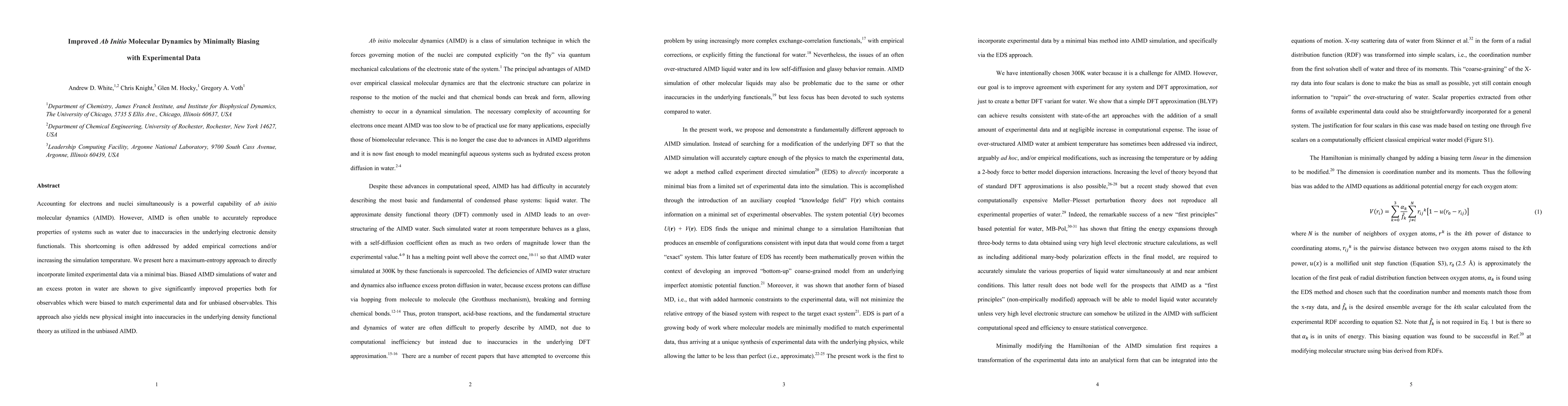 A new approach using maximum-entropy method improves ab initio molecular dynamics simulations of water and excess proton in water by incorporating limited experimental data with minimal bias, yielding significantly improved properties and new insights into density functional theory inaccuracies.