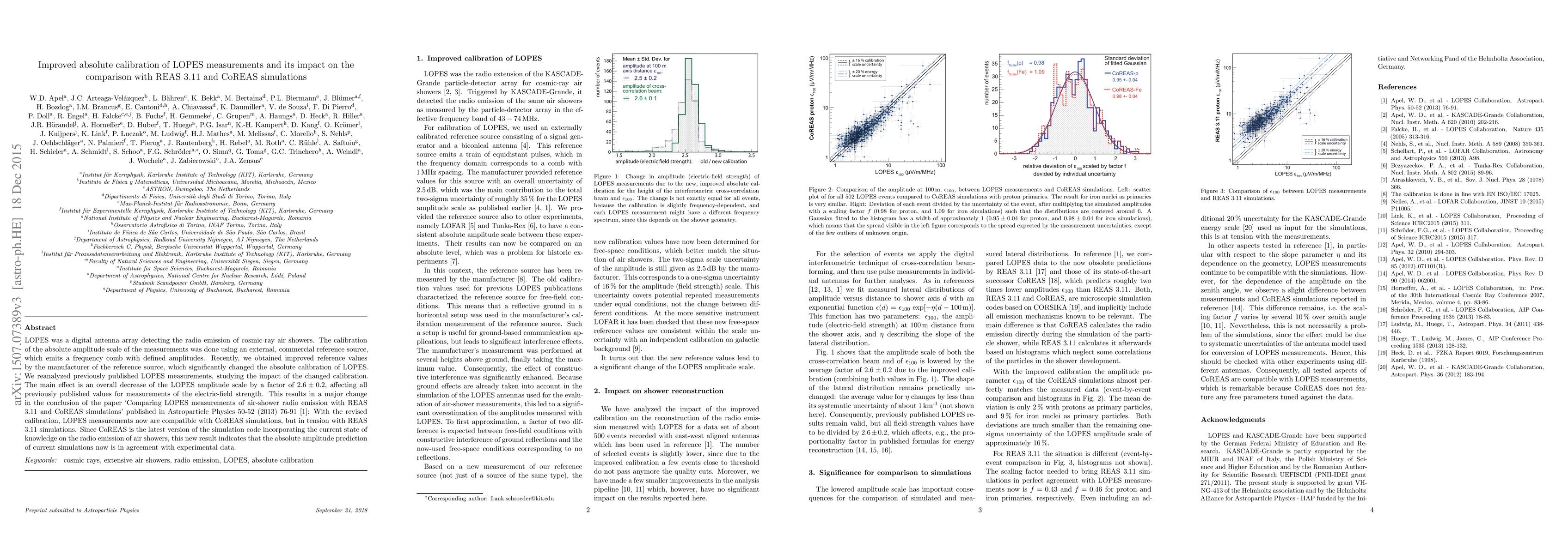 The improved absolute calibration of LOPES measurements results in a 2.6-fold decrease in the amplitude scale, leading to compatibility with CoREAS simulations but tension with REAS 3.11 simulations, indicating better alignment of current simulation predictions with experimental data.