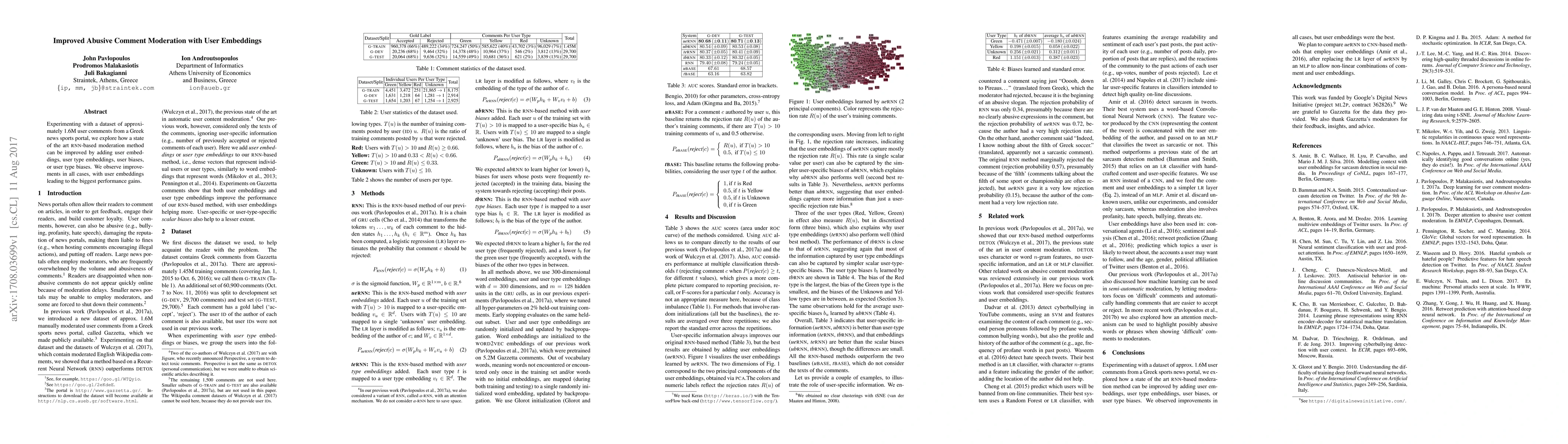 Experimenting with a dataset of approximately 1.6M user comments from a Greek news sports portal, we explore how a state of the art RNN-based moderation method can be improved by adding user embeddings, user type embeddings, user biases, or user type biases. We observe improvements in all cases, with user embeddings leading to the biggest performance gains.