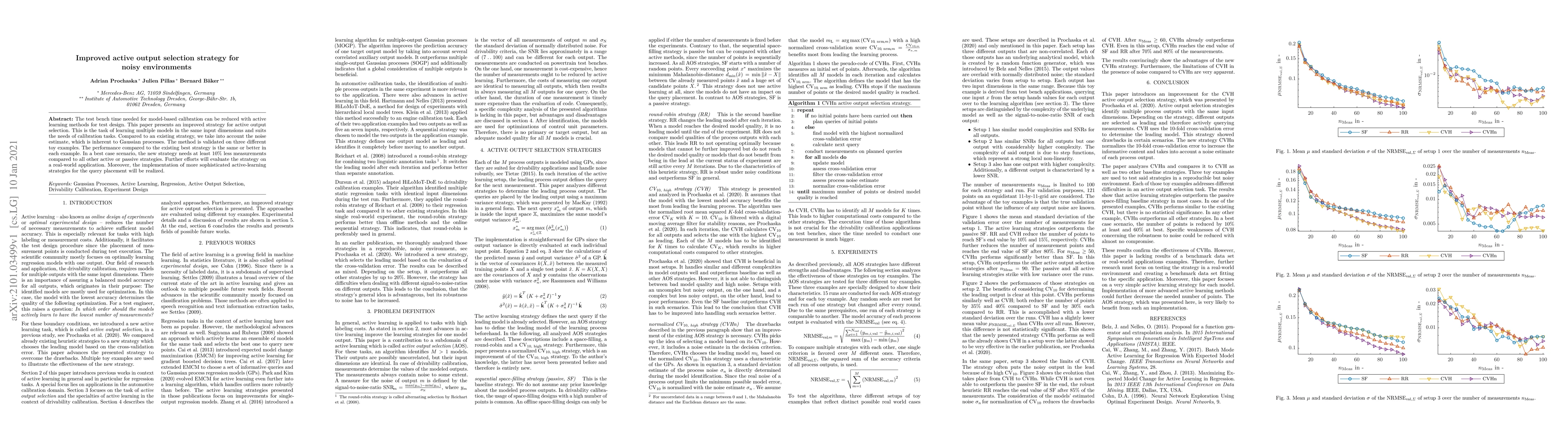 The test bench time needed for model-based calibration can be reduced with active learning methods for test design. This paper presents an improved strategy for active output selection. This is the task of learning multiple models in the same input dimensions and suits the needs of calibration tasks. Compared to an existing strategy, we take into account the noise estimate, which is inherent to Gaussian processes. The method is validated on three different toy examples. The performance compared to the existing best strategy is the same or better in each example. In a best case scenario, the new strategy needs at least 10% less measurements compared to all other active or passive strategies. Further efforts will evaluate the strategy on a real-world application. Moreover, the implementation of more sophisticated active-learning strategies for the query placement will be realized.