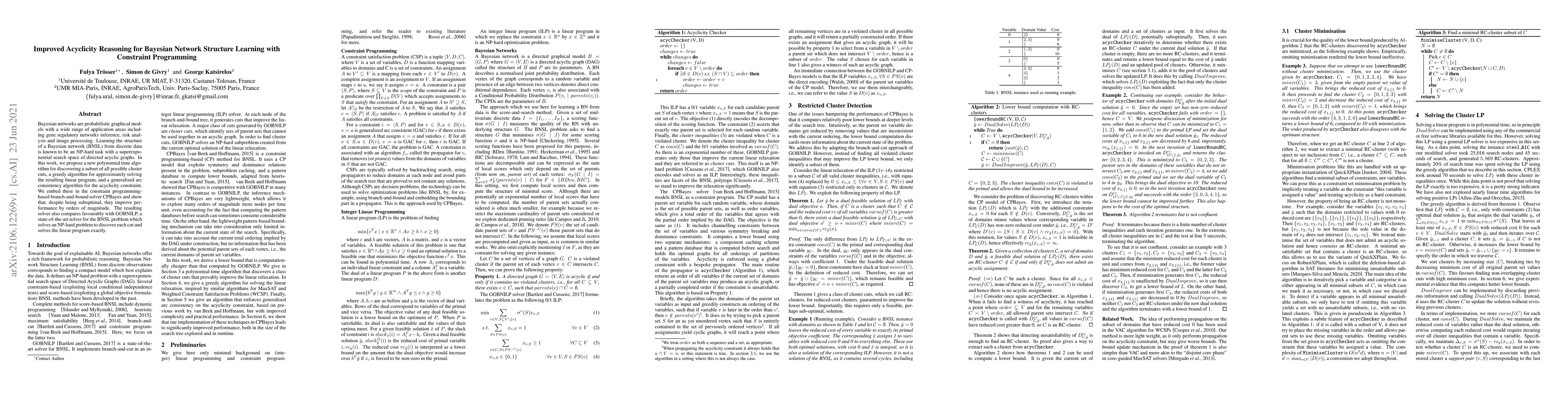 Bayesian networks are probabilistic graphical models with a wide range of application areas including gene regulatory networks inference, risk analysis and image processing. Learning the structure of a Bayesian network (BNSL) from discrete data is known to be an NP-hard task with a superexponential search space of directed acyclic graphs. In this work, we propose a new polynomial time algorithm for discovering a subset of all possible cluster cuts, a greedy algorithm for approximately solving the resulting linear program, and a generalised arc consistency algorithm for the acyclicity constraint. We embed these in the constraint programmingbased branch-and-bound solver CPBayes and show that, despite being suboptimal, they improve performance by orders of magnitude. The resulting solver also compares favourably with GOBNILP, a state-of-the-art solver for the BNSL problem which solves an NP-hard problem to discover each cut and solves the linear program exactly.