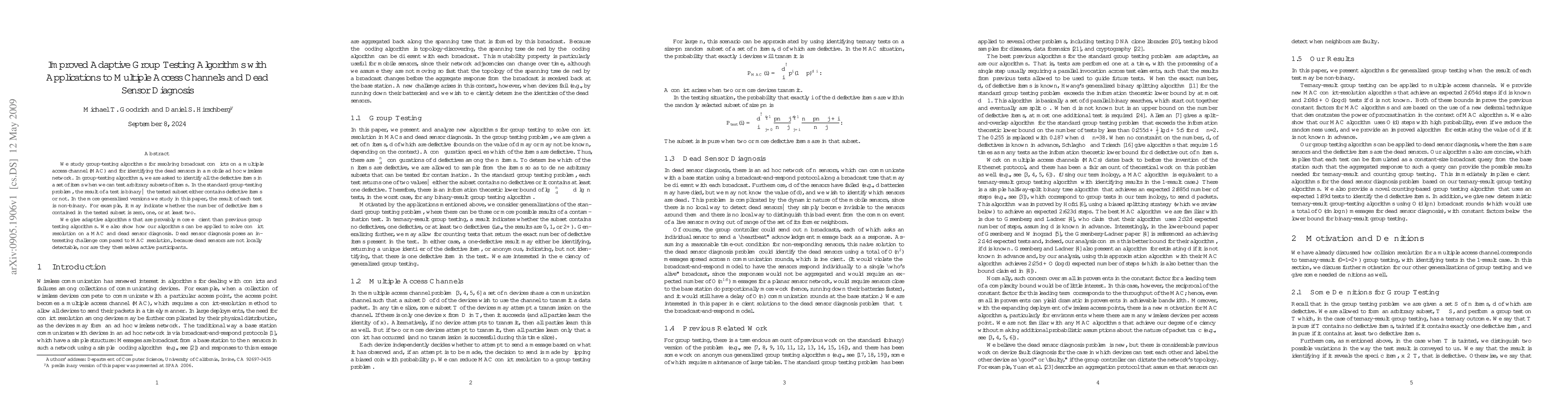 We study group-testing algorithms for resolving broadcast conflicts on a multiple access channel (MAC) and for identifying the dead sensors in a mobile ad hoc wireless network. In group-testing algorithms, we are asked to identify all the defective items in a set of items when we can test arbitrary subsets of items. In the standard group-testing problem, the result of a test is binary--the tested subset either contains defective items or not. In the more generalized versions we study in this paper, the result of each test is non-binary. For example, it may indicate whether the number of defective items contained in the tested subset is zero, one, or at least two. We give adaptive algorithms that are provably more efficient than previous group testing algorithms. We also show how our algorithms can be applied to solve conflict resolution on a MAC and dead sensor diagnosis. Dead sensor diagnosis poses an interesting challenge compared to MAC resolution, because dead sensors are not locally detectable, nor are they themselves active participants.