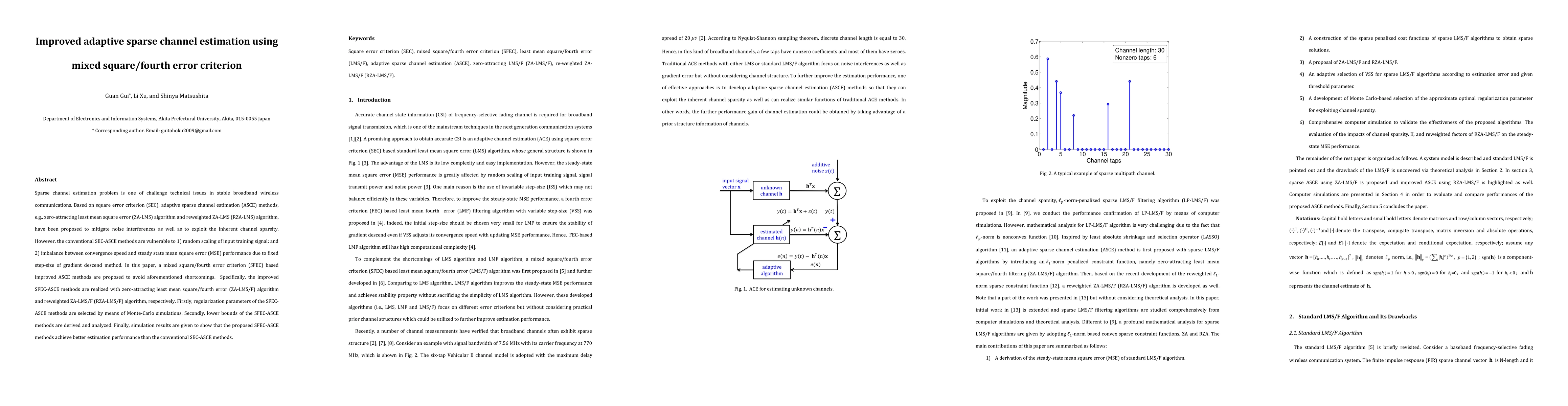 This paper proposes improved adaptive sparse channel estimation methods using a mixed square/fourth error criterion (SFEC) to overcome limitations of conventional square error criterion (SEC) methods. The new SFEC-ASCE methods, including ZA-LMS/F and RZA-LMS/F algorithms, demonstrate better performance in noise interference mitigation and channel sparsity exploitation, as shown through Monte-Carlo simulations and comparative analysis.