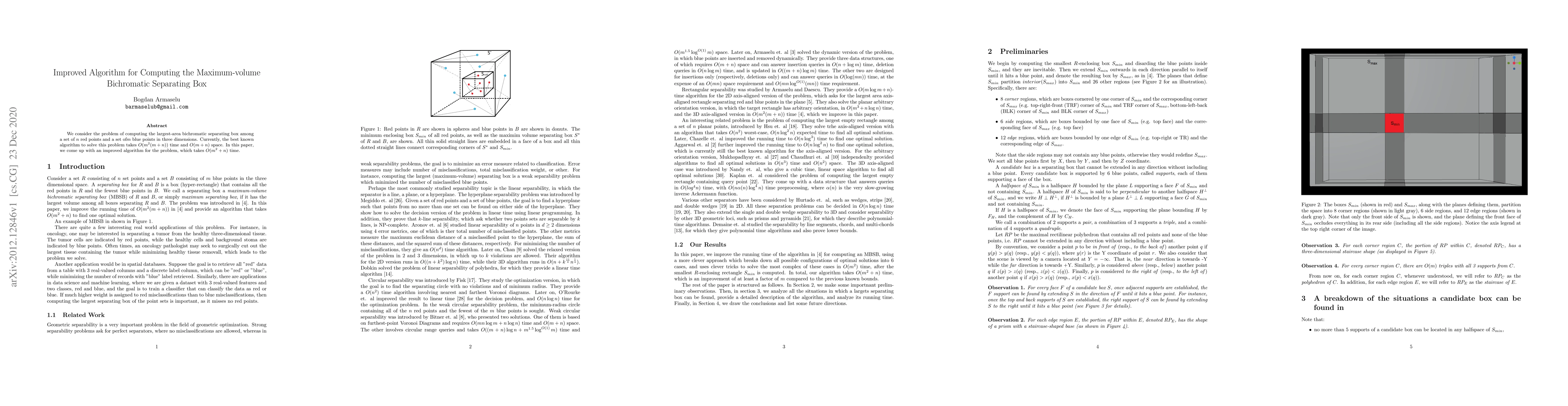 This paper presents an improved algorithm for computing the maximum-volume bichromatic separating box in three dimensions, reducing the time complexity from $O(m^2 (m + n))$ to $O(m^2 + n)$ while maintaining $O(m + n)$ space complexity.