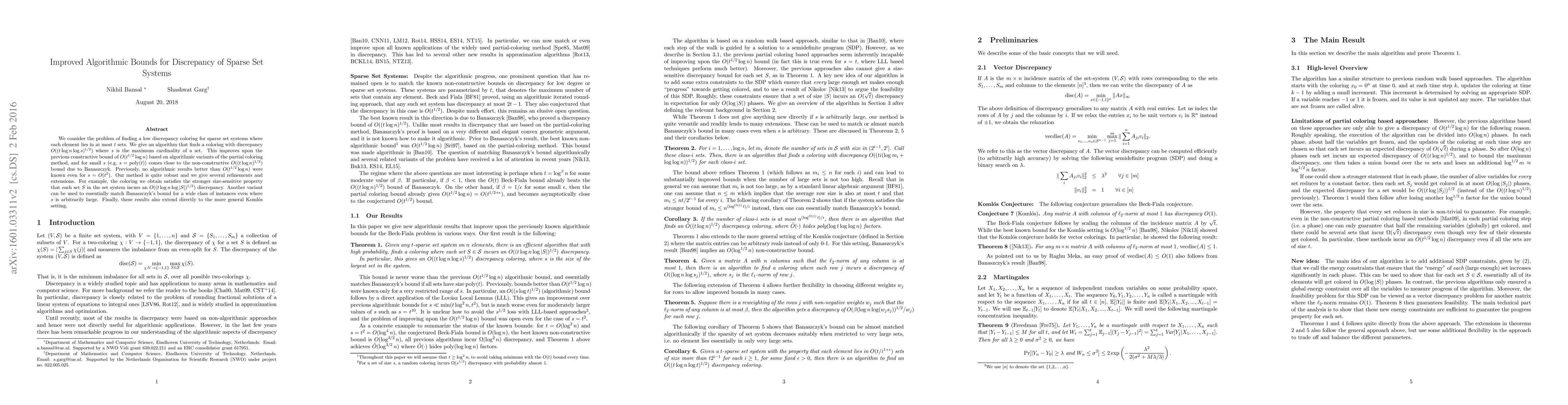 This paper presents an improved algorithmic bound for the discrepancy of sparse set systems, achieving $O((t \log n \log s)^{1/2})$, where $s$ is the maximum set cardinality. This surpasses previous bounds and approaches the non-constructive $O((t \log n)^{1/2})$ bound, especially for small $s$.