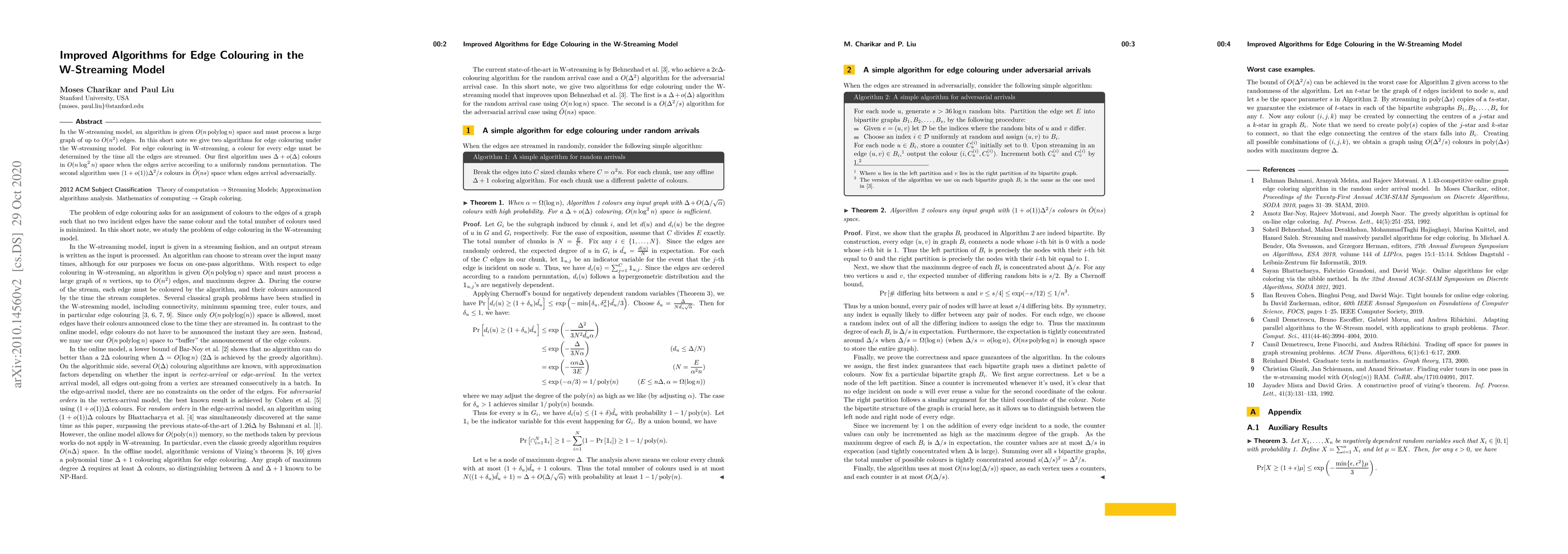 This paper presents two algorithms for edge colouring in the W-streaming model, where the goal is to determine the colour for each edge within limited space. The first algorithm uses $\Delta + o(\Delta)$ colours with $O(n \log^2 n)$ space for uniformly random edge arrivals. The second algorithm employs $(1 + o(1))\Delta^2 / s$ colours in $\tilde{O}(n s)$ space for adversarial edge arrivals.