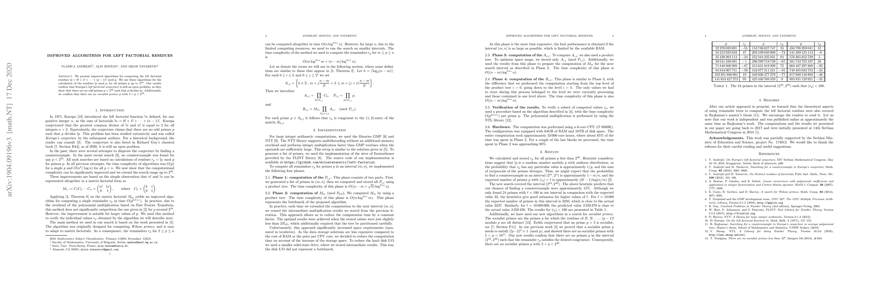 This paper introduces enhanced algorithms for calculating left factorial residues $!p$ modulo $p$, confirming that Kurepa's left factorial conjecture remains unproven and that no odd primes below $2^{40}$ divide $!p$. Additionally, it verifies the absence of socialist primes between 5 and $2^{40}$.