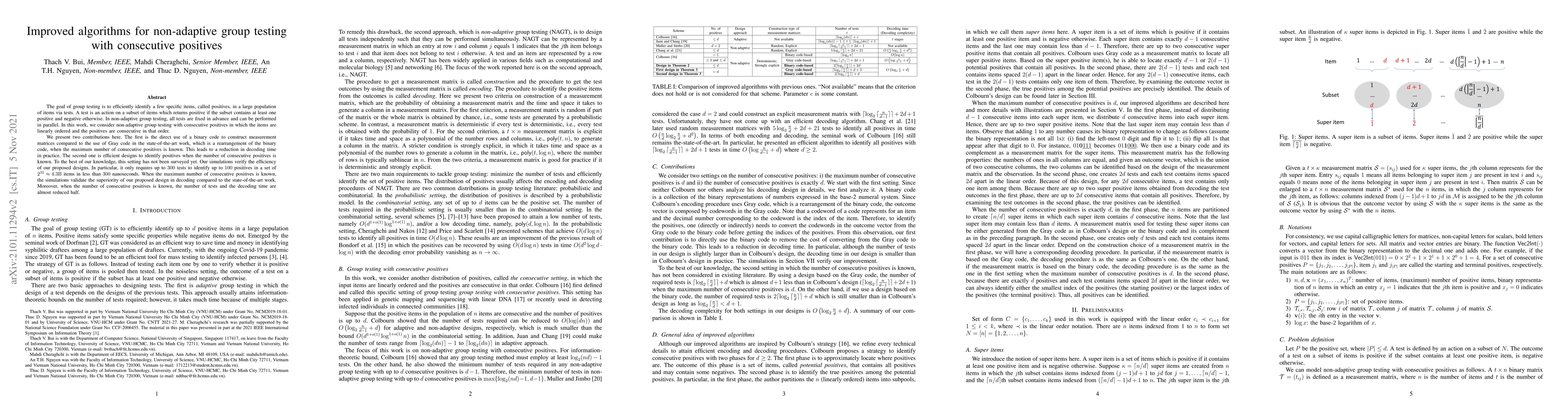 This paper presents improved algorithms for non-adaptive group testing with consecutive positives, utilizing binary codes for measurement matrices to reduce decoding time. The proposed designs efficiently identify positives when the number of consecutive positives is known, requiring up to 300 tests for 100 positives in a large population, outperforming the state-of-the-art.