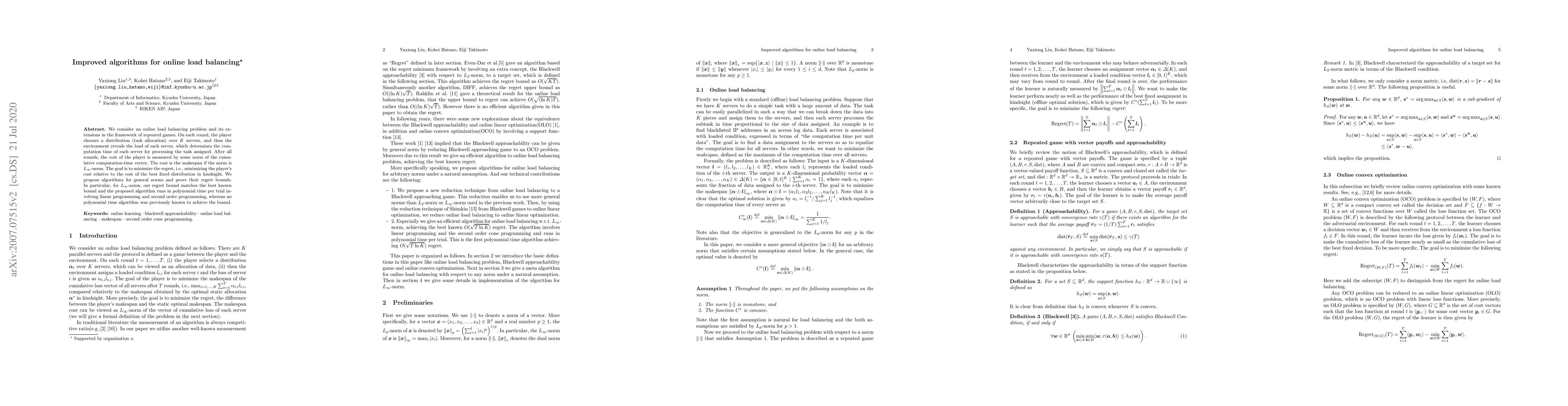 This paper proposes improved algorithms for online load balancing in repeated games, focusing on minimizing regret relative to the best fixed distribution. It introduces polynomial-time algorithms for general norms, notably matching the best-known bound for $L_\infty$-norm using linear and second-order programming.