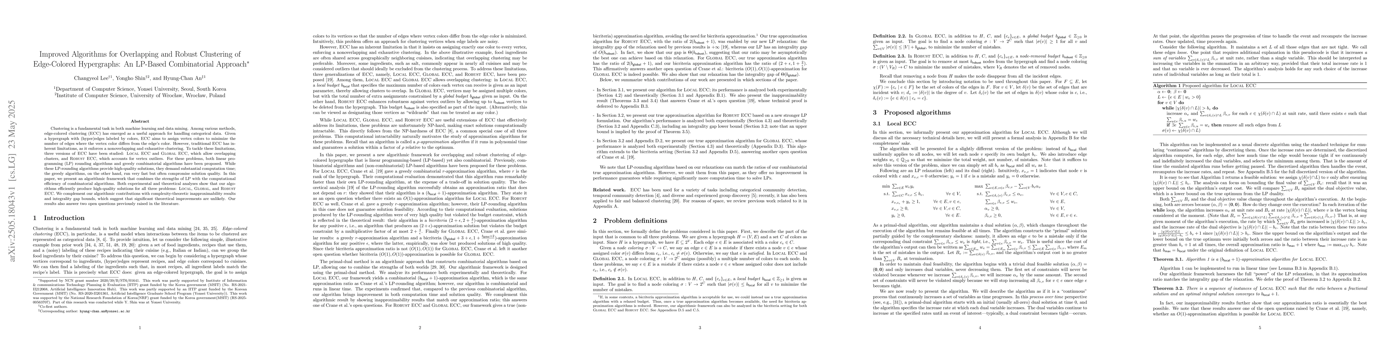 Clustering is a fundamental task in both machine learning and data mining. Among various methods, edge-colored clustering (ECC) has emerged as a useful approach for handling categorical data. Given a hypergraph with (hyper)edges labeled by colors, ECC aims to assign vertex colors to minimize the number of edges where the vertex color differs from the edge's color. However, traditional ECC has inherent limitations, as it enforces a nonoverlapping and exhaustive clustering. To tackle these limitations, three versions of ECC have been studied: Local ECC and Global ECC, which allow overlapping clusters, and Robust ECC, which accounts for vertex outliers. For these problems, both linear programming (LP) rounding algorithms and greedy combinatorial algorithms have been proposed. While these LP-rounding algorithms provide high-quality solutions, they demand substantial computation time; the greedy algorithms, on the other hand, run very fast but often compromise solution quality. In this paper, we present an algorithmic framework that combines the strengths of LP with the computational efficiency of combinatorial algorithms. Both experimental and theoretical analyses show that our algorithms efficiently produce high-quality solutions for all three problems: Local, Global, and Robust ECC. We complement our algorithmic contributions with complexity-theoretic inapproximability results and integrality gap bounds, which suggest that significant theoretical improvements are unlikely. Our results also answer two open questions previously raised in the literature.