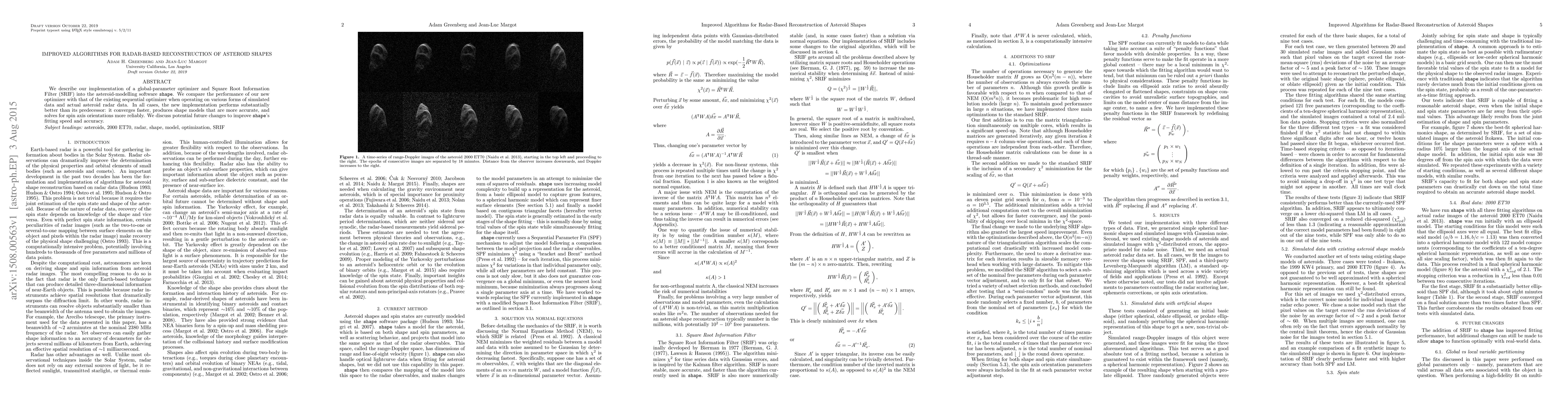 We describe our implementation of a global-parameter optimizer and Square Root Information Filter (SRIF) into the asteroid-modelling software SHAPE. We compare the performance of our new optimizer with that of the existing sequential optimizer when operating on various forms of simulated data and actual asteroid radar data. In all cases, the new implementation performs substantially better than its predecessor: it converges faster, produces shape models that are more accurate, and solves for spin axis orientations more reliably. We discuss potential future changes to improve SHAPE's fitting speed and accuracy.