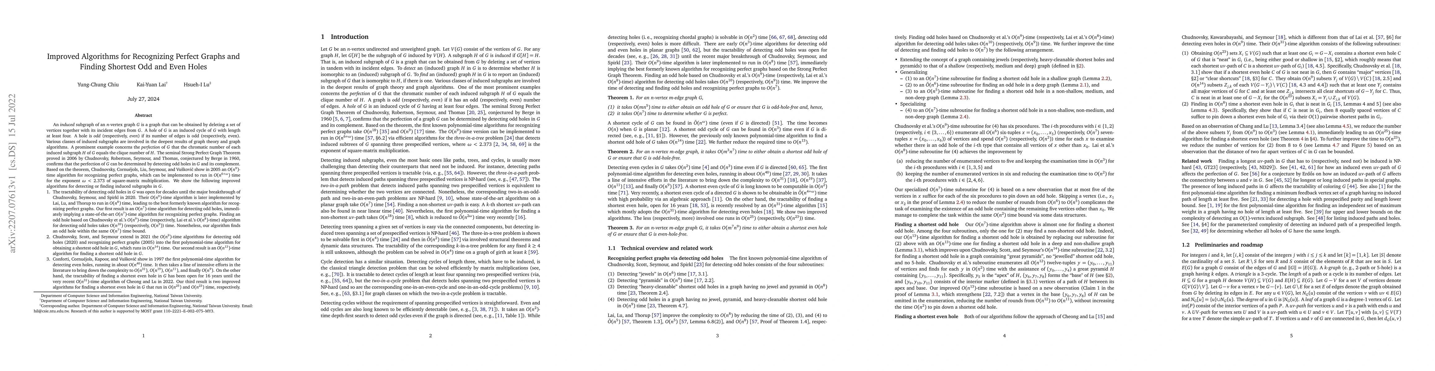 This paper presents improved algorithms for recognizing perfect graphs and finding shortest odd and even holes. It introduces an $O(n^7)$ algorithm for detecting odd holes, an $O(n^{13})$ algorithm for finding shortest odd holes, and an $O(n^{23})$ algorithm for finding shortest even holes.