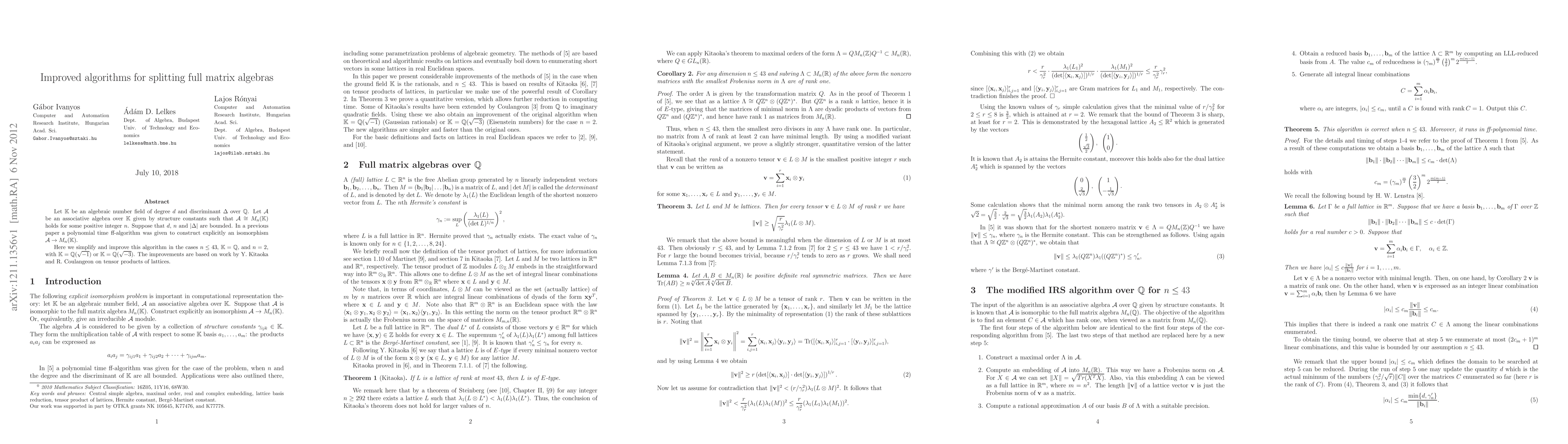 Let $\K$ be an algebraic number field of degree $d$ and discriminant $\Delta$ over $\Q$. Let $\A$ be an associative algebra over $\K$ given by structure constants such that $\A\cong M_n(\K)$ holds for some positive integer $n$. Suppose that $d$, $n$ and $|\Delta|$ are bounded. In a previous paper a polynomial time ff-algorithm was given to construct explicitly an isomorphism $\A \rightarrow M_n(\K)$. Here we simplify and improve this algorithm in the cases $n\leq 43$, $\K=\Q$, and $n=2$, with $\K=\Q(\sqrt{-1})$ or $\K=\Q(\sqrt{-3})$. The improvements are based on work by Y. Kitaoka and R. Coulangeon on tensor products of lattices.