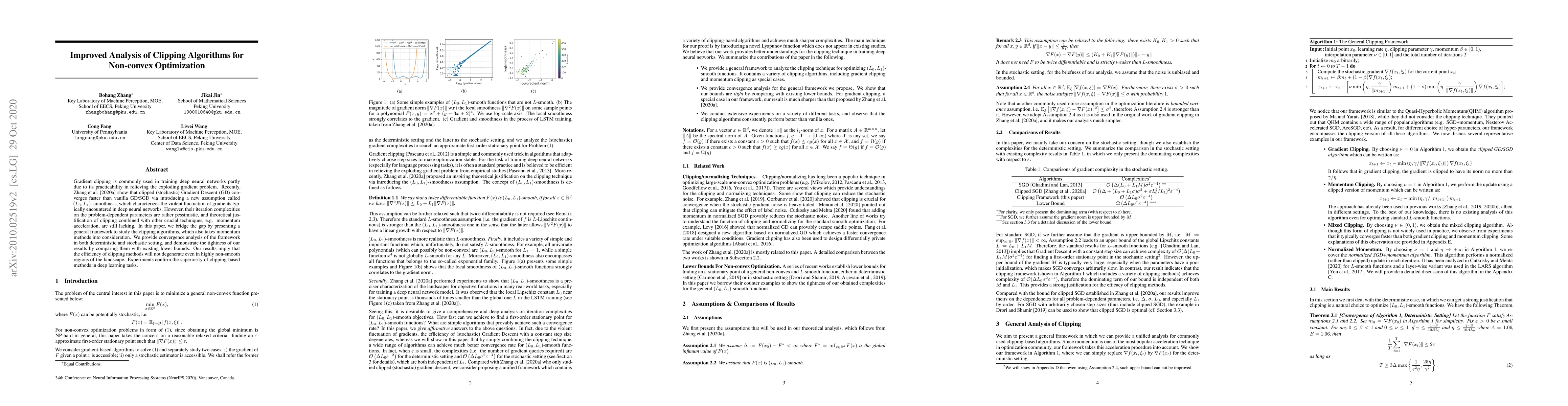 Gradient clipping is commonly used in training deep neural networks partly due to its practicability in relieving the exploding gradient problem. Recently, \citet{zhang2019gradient} show that clipped (stochastic) Gradient Descent (GD) converges faster than vanilla GD/SGD via introducing a new assumption called $(L_0, L_1)$-smoothness, which characterizes the violent fluctuation of gradients typically encountered in deep neural networks. However, their iteration complexities on the problem-dependent parameters are rather pessimistic, and theoretical justification of clipping combined with other crucial techniques, e.g. momentum acceleration, are still lacking. In this paper, we bridge the gap by presenting a general framework to study the clipping algorithms, which also takes momentum methods into consideration. We provide convergence analysis of the framework in both deterministic and stochastic setting, and demonstrate the tightness of our results by comparing them with existing lower bounds. Our results imply that the efficiency of clipping methods will not degenerate even in highly non-smooth regions of the landscape. Experiments confirm the superiority of clipping-based methods in deep learning tasks.