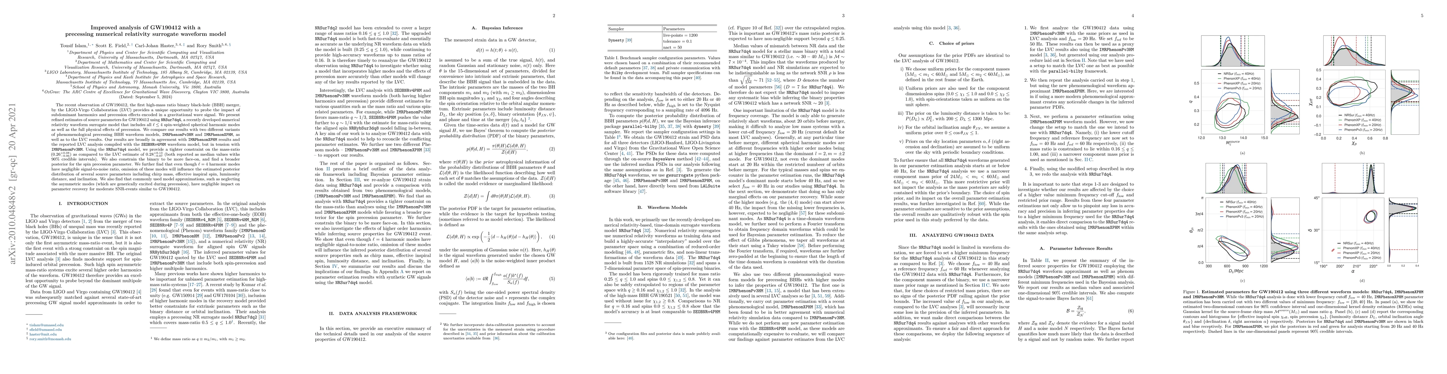 The recent observation of GW190412, the first high-mass ratio binary black-hole (BBH) merger, by the LIGO-Virgo Collaboration (LVC) provides a unique opportunity to probe the impact of subdominant harmonics and precession effects encoded in a gravitational wave signal. We present refined estimates of source parameters for GW190412 using \texttt{NRSur7dq4}, a recently developed numerical relativity waveform surrogate model that includes all $\ell \leq 4$ spin-weighted spherical harmonic modes as well as the full physical effects of precession. We compare our results with two different variants of phenomenological precessing BBH waveform models, \texttt{IMRPhenomPv3HM} and \texttt{IMRPhenomXPHM}, as well as to the LVC results. Our results are broadly in agreement with \texttt{IMRPhenomXPHM} results and the reported LVC analysis compiled with the \texttt{SEOBNRv4PHM} waveform model, but in tension with \texttt{IMRPhenomPv3HM}. Using the \texttt{NRSur7dq4} model, we provide a tighter constraint on the mass-ratio ($0.26^{+0.08}_{-0.06}$) as compared to the LVC estimate of $0.28^{+0.13}_{-0.07}$ (both reported as median values withs 90\% credible intervals). We also constrain the binary to be more face-on, and find a broader posterior for the spin precession parameter. We further find that even though $\ell=4$ harmonic modes have negligible signal-to-noise ratio, omission of these modes will influence the estimated posterior distribution of several source parameters including chirp mass, effective inspiral spin, luminosity distance, and inclination. We also find that commonly used model approximations, such as neglecting the asymmetric modes (which are generically excited during precession), have negligible impact on parameter recovery for moderate SNR-events similar to GW190412.