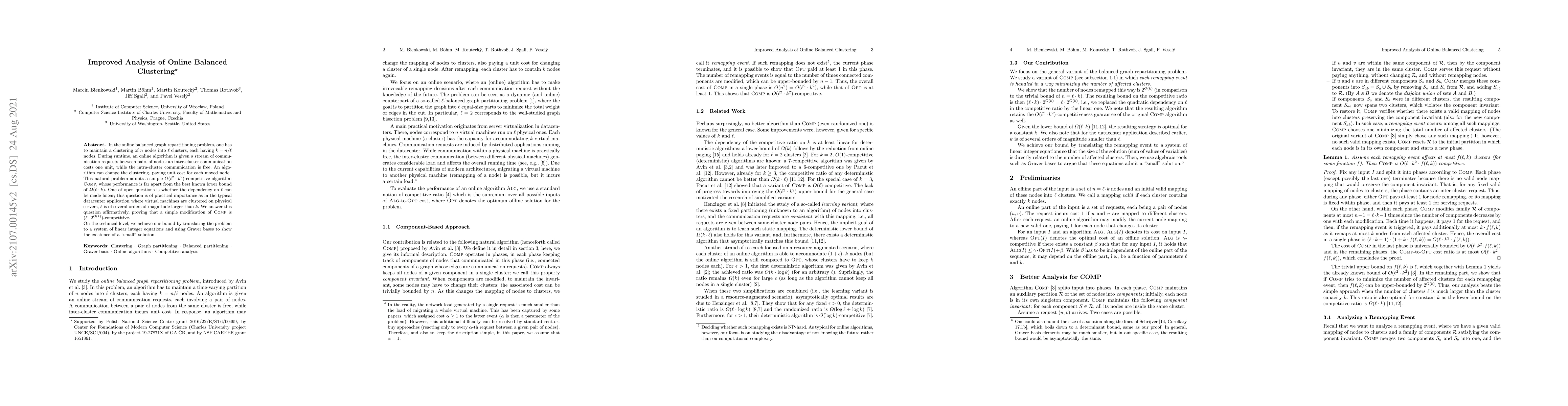 This research paper improves upon a known algorithm for online balanced clustering by achieving an $O( heta ight)^{s}$-competitive bound where $ heta= ceil rac{ }{ ceil}$ and $s=O(k)$, with practical implications for optimizing virtual machine clustering in datacenters.