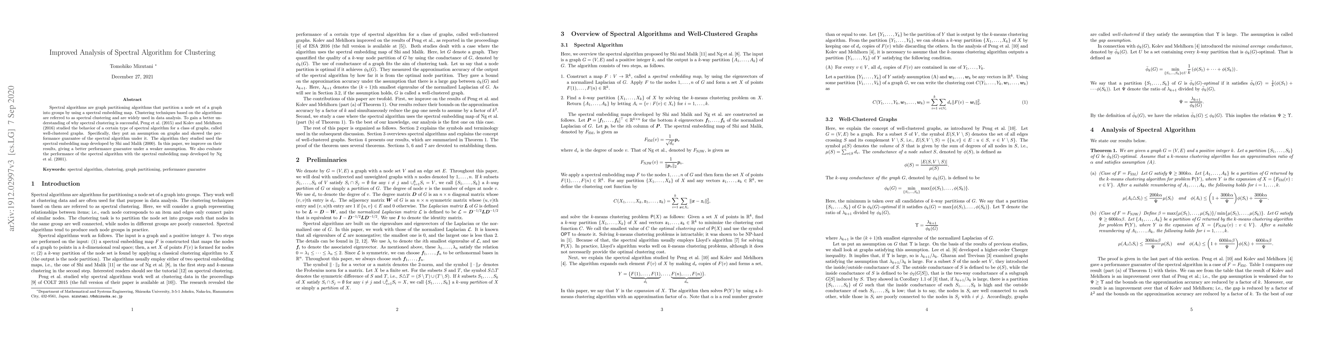 This paper enhances the analysis of spectral clustering algorithms, providing a better performance guarantee under a weaker assumption compared to previous studies. It also evaluates the spectral algorithm using a different spectral embedding map, improving upon earlier work by Peng et al. and Kolev and Mehlhorn.