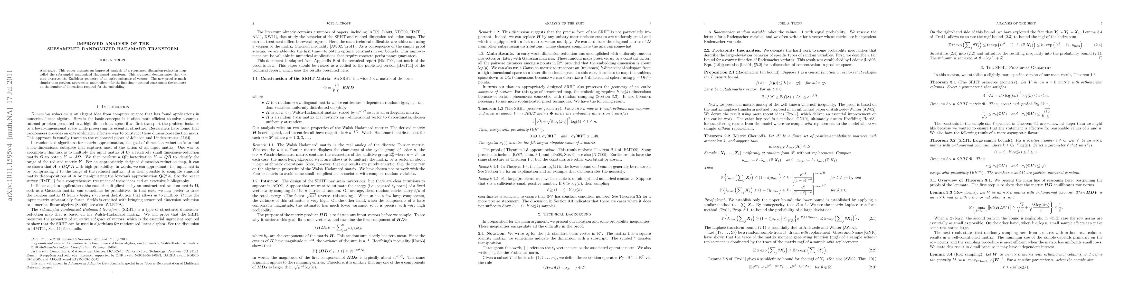This paper provides a simpler analysis of the subsampled randomized Hadamard transform, showing it preserves Euclidean geometry in subspaces, and for the first time, offers optimal constants for the required dimensions in the embedding.