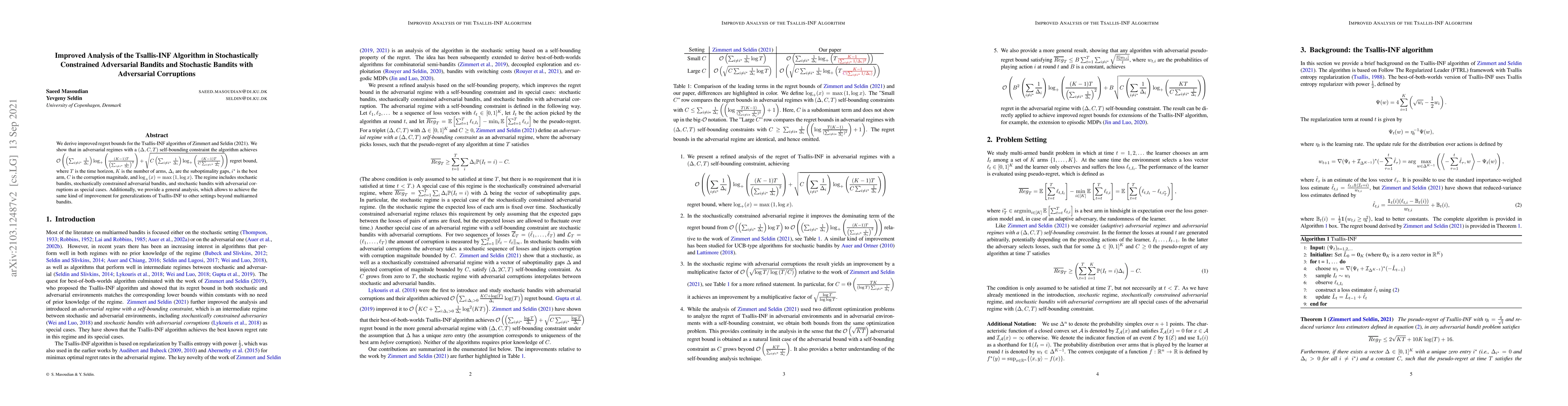 This paper improves regret bounds for the Tsallis-INF algorithm in adversarial and stochastic bandit settings, achieving a new $\mathcal{O}$-order regret bound under $(\Delta,C,T)$ constraints. The analysis extends to various bandit regimes including stochastic, adversarial, and corrupted scenarios.
