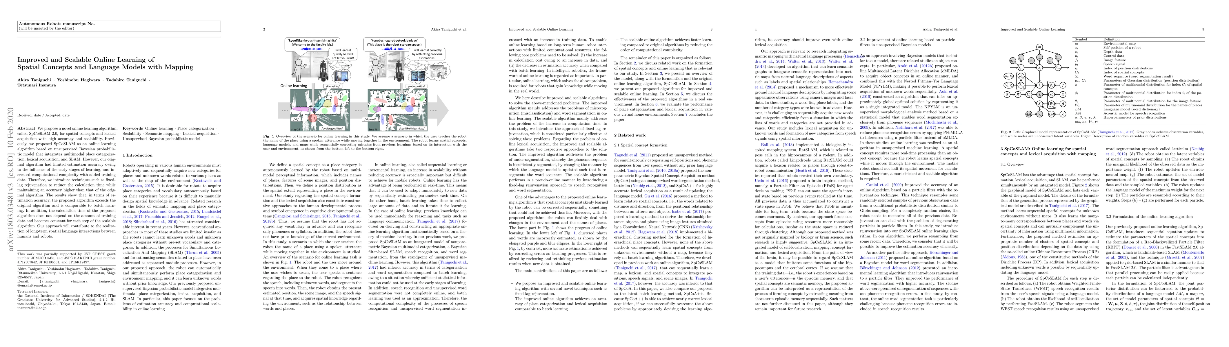 We propose a novel online learning algorithm, called SpCoSLAM 2.0, for spatial concepts and lexical acquisition with high accuracy and scalability. Previously, we proposed SpCoSLAM as an online learning algorithm based on unsupervised Bayesian probabilistic model that integrates multimodal place categorization, lexical acquisition, and SLAM. However, our original algorithm had limited estimation accuracy owing to the influence of the early stages of learning, and increased computational complexity with added training data. Therefore, we introduce techniques such as fixed-lag rejuvenation to reduce the calculation time while maintaining an accuracy higher than that of the original algorithm. The results show that, in terms of estimation accuracy, the proposed algorithm exceeds the original algorithm and is comparable to batch learning. In addition, the calculation time of the proposed algorithm does not depend on the amount of training data and becomes constant for each step of the scalable algorithm. Our approach will contribute to the realization of long-term spatial language interactions between humans and robots.