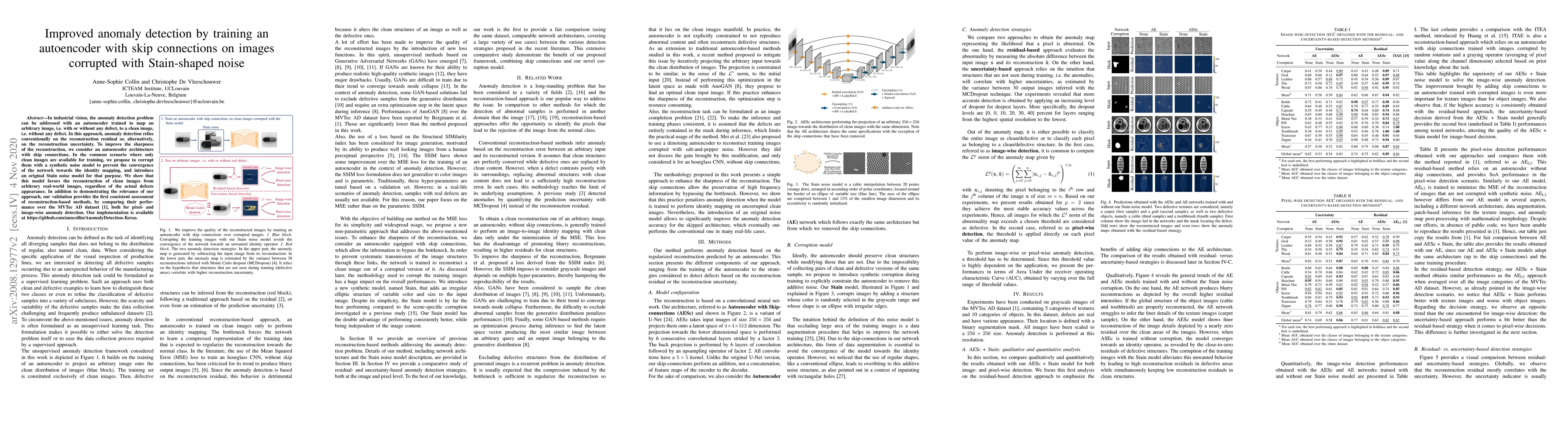In industrial vision, the anomaly detection problem can be addressed with an autoencoder trained to map an arbitrary image, i.e. with or without any defect, to a clean image, i.e. without any defect. In this approach, anomaly detection relies conventionally on the reconstruction residual or, alternatively, on the reconstruction uncertainty. To improve the sharpness of the reconstruction, we consider an autoencoder architecture with skip connections. In the common scenario where only clean images are available for training, we propose to corrupt them with a synthetic noise model to prevent the convergence of the network towards the identity mapping, and introduce an original Stain noise model for that purpose. We show that this model favors the reconstruction of clean images from arbitrary real-world images, regardless of the actual defects appearance. In addition to demonstrating the relevance of our approach, our validation provides the first consistent assessment of reconstruction-based methods, by comparing their performance over the MVTec AD dataset, both for pixel- and image-wise anomaly detection.