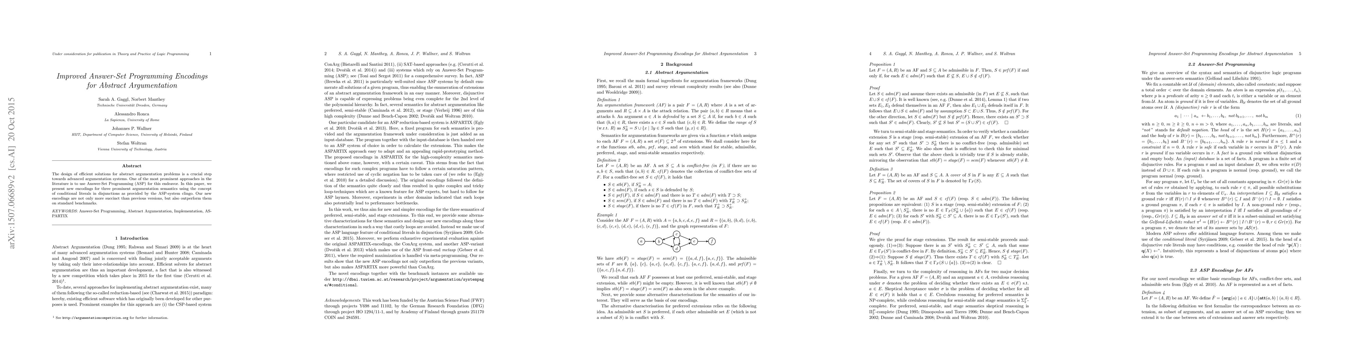 This paper introduces improved ASP encodings for abstract argumentation, leveraging conditional literals in disjunctions to create more succinct and efficient solutions that outperform previous methods on standard benchmarks.