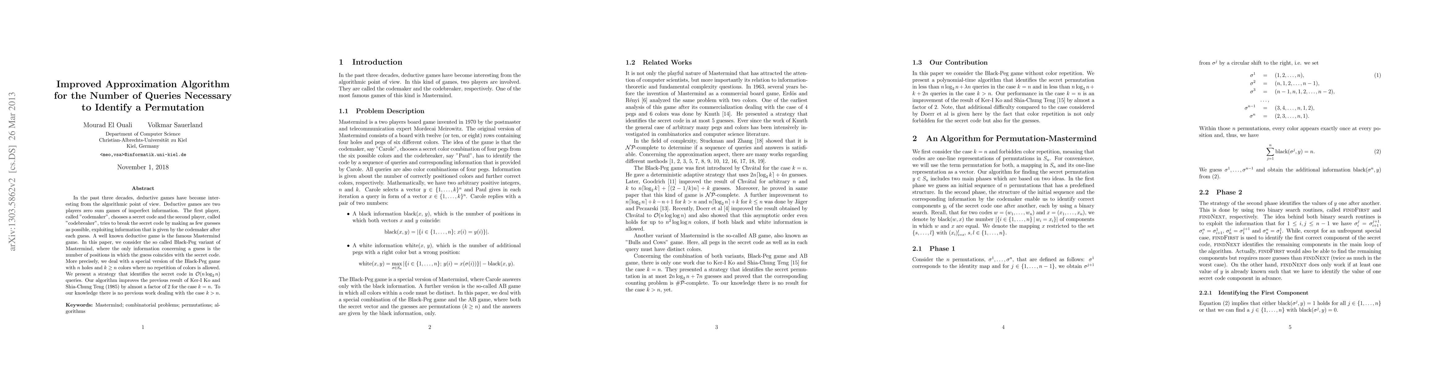 In the past three decades, deductive games have become interesting from the algorithmic point of view. Deductive games are two players zero sum games of imperfect information. The first player, called "codemaker", chooses a secret code and the second player, called "codebreaker", tries to break the secret code by making as few guesses as possible, exploiting information that is given by the codemaker after each guess. A well known deductive game is the famous Mastermind game. In this paper, we consider the so called Black-Peg variant of Mastermind, where the only information concerning a guess is the number of positions in which the guess coincides with the secret code. More precisely, we deal with a special version of the Black-Peg game with n holes and k >= n colors where no repetition of colors is allowed. We present a strategy that identifies the secret code in O(n log n) queries. Our algorithm improves the previous result of Ker-I Ko and Shia-Chung Teng (1985) by almost a factor of 2 for the case k = n. To our knowledge there is no previous work dealing with the case k > n. Keywords: Mastermind; combinatorial problems; permutations; algorithms