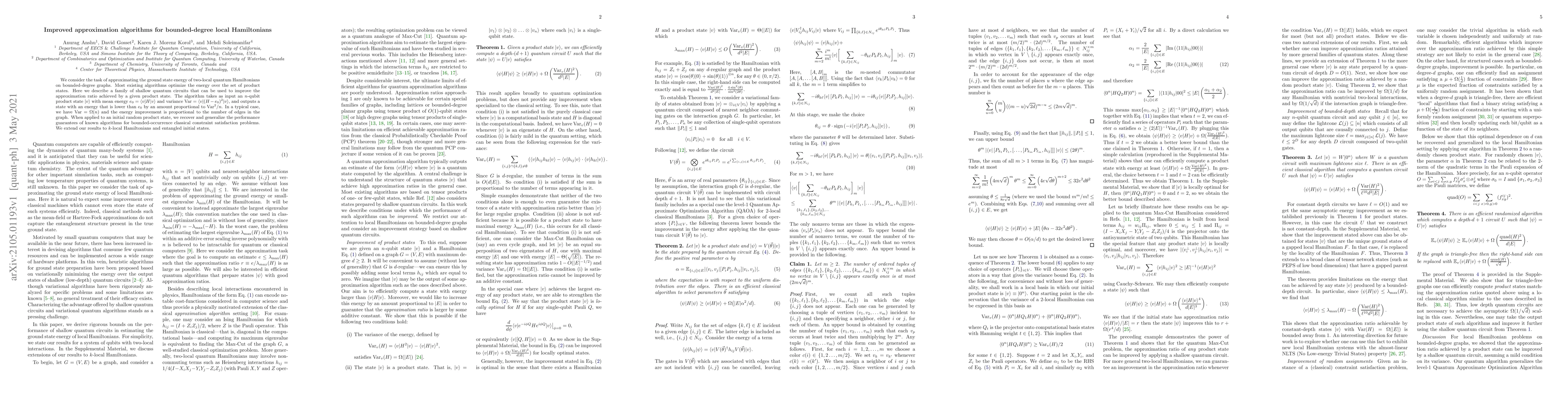 This paper presents improved approximation algorithms for estimating the ground state energy of two-local quantum Hamiltonians on bounded-degree graphs using shallow quantum circuits. The proposed method enhances the energy approximation by leveraging the variance of initial product states, achieving an improvement proportional to the variance squared divided by the number of qubits.