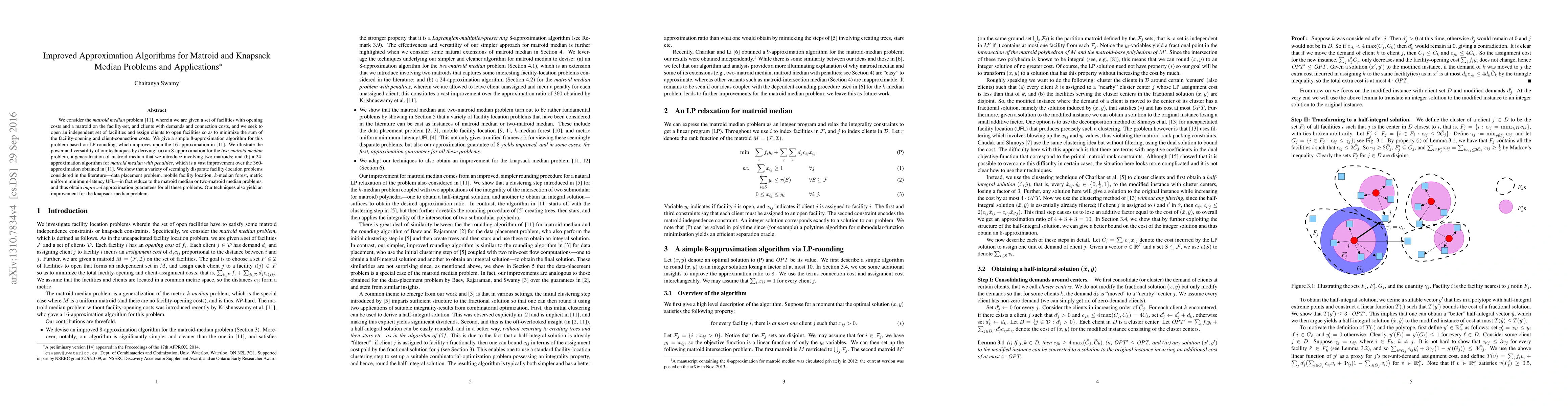 The paper introduces a novel approach to convert LP solutions to half-integral solutions and then round them using a UFL-style clustering step, leading to improved approximation ratios for matroid and knapsack median problems.