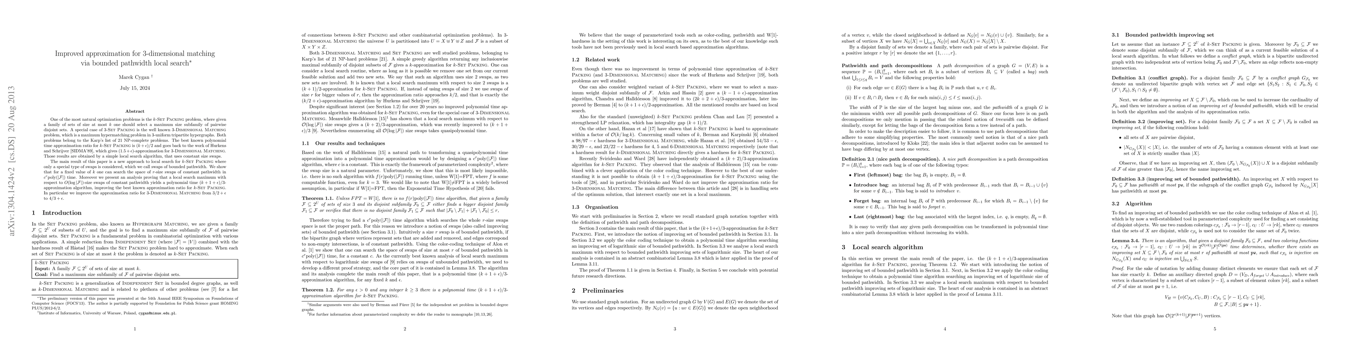 One of the most natural optimization problems is the k-Set Packing problem, where given a family of sets of size at most k one should select a maximum size subfamily of pairwise disjoint sets. A special case of 3-Set Packing is the well known 3-Dimensional Matching problem. Both problems belong to the Karp`s list of 21 NP-complete problems. The best known polynomial time approximation ratio for k-Set Packing is (k + eps)/2 and goes back to the work of Hurkens and Schrijver [SIDMA`89], which gives (1.5 + eps)-approximation for 3-Dimensional Matching. Those results are obtained by a simple local search algorithm, that uses constant size swaps. The main result of the paper is a new approach to local search for k-Set Packing where only a special type of swaps is considered, which we call swaps of bounded pathwidth. We show that for a fixed value of k one can search the space of r-size swaps of constant pathwidth in c^r poly(|F|) time. Moreover we present an analysis proving that a local search maximum with respect to O(log |F|)-size swaps of constant pathwidth yields a polynomial time (k + 1 + eps)/3-approximation algorithm, improving the best known approximation ratio for k-Set Packing. In particular we improve the approximation ratio for 3-Dimensional Matching from 3/2 + eps to 4/3 + eps.
