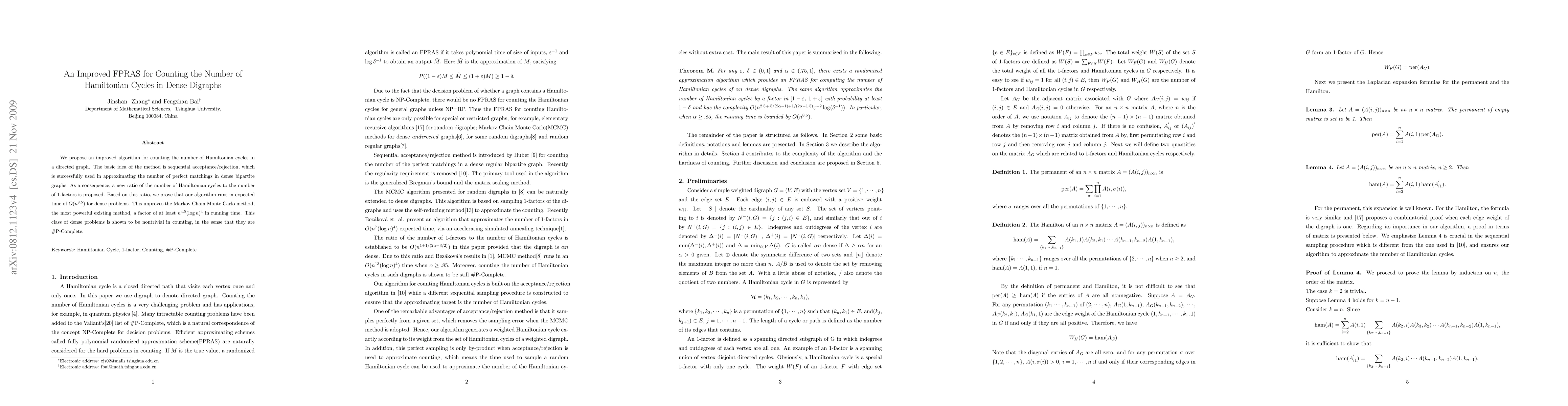 This paper presents an improved algorithm for counting Hamiltonian cycles in dense directed graphs using a sequential acceptance/rejection method, achieving an expected runtime of $O(n^{8.5})$, significantly faster than the existing Markov chain method by a factor of $n^{4.5}(\log n)^{4}$. The method leverages the ratio of 1-factors to derive a new bound on Hamiltonian cycles.