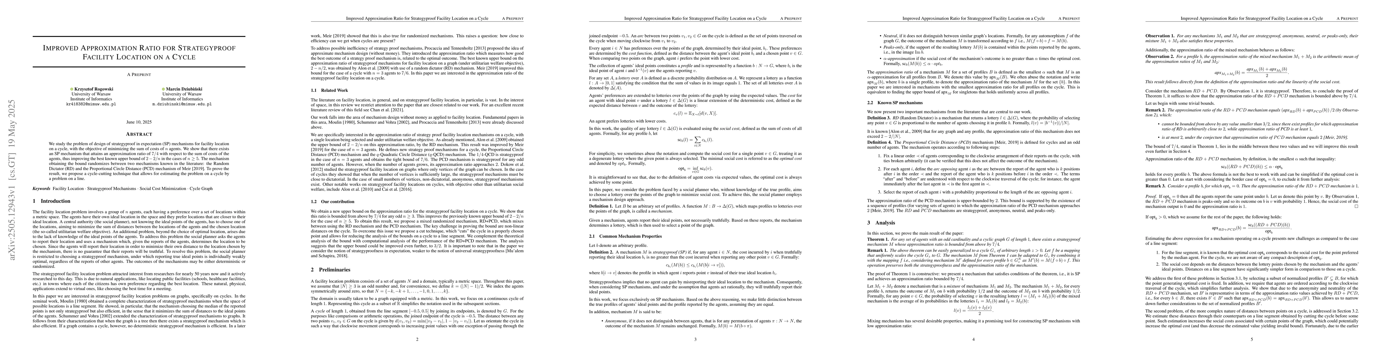 Researchers developed a strategyproof facility location mechanism that achieves an approximation ratio of 7/4 on a cycle, improving the previous best known bound of 2-2/n for n >= 5.
