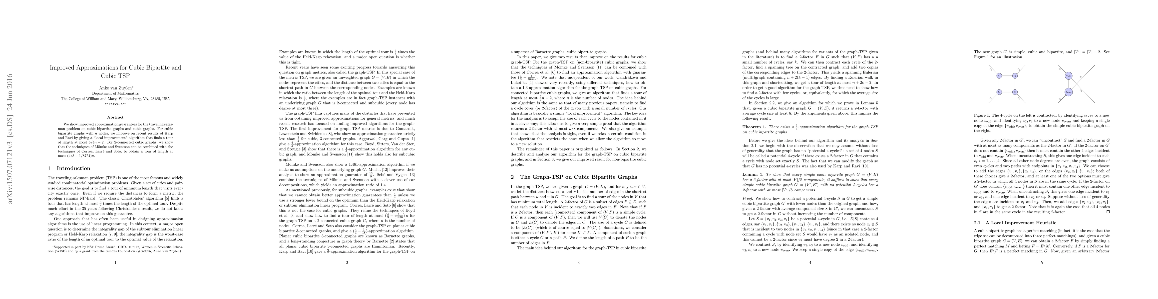 We show improved approximation guarantees for the traveling salesman problem on cubic graphs, and cubic bipartite graphs. For cubic bipartite graphs with n nodes, we improve on recent results of Karp and Ravi (2014) by giving a simple "local improvement" algorithm that finds a tour of length at most 5/4 n - 2. For 2-connected cubic graphs, we show that the techniques of Moemke and Svensson (2011) can be combined with the techniques of Correa, Larre and Soto (2012), to obtain a tour of length at most (4/3-1/8754)n.