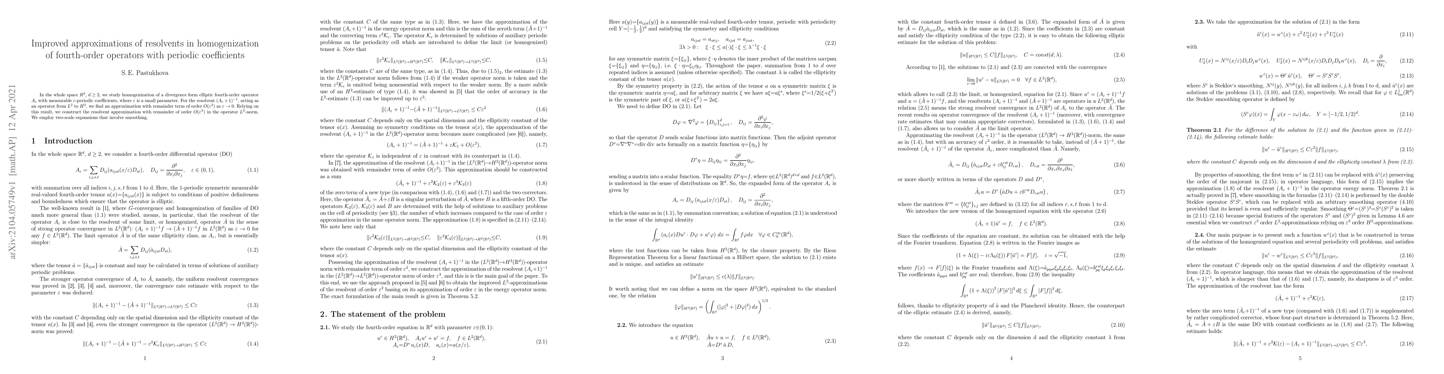 This paper studies the homogenization of fourth-order elliptic operators with periodic coefficients in $R^d$. It provides improved approximations for the resolvent $(A_\varepsilon+1)^{-1}$ with error terms of $O(\varepsilon^2)$ and $O(\varepsilon^3)$ using two-scale expansions and smoothing techniques.