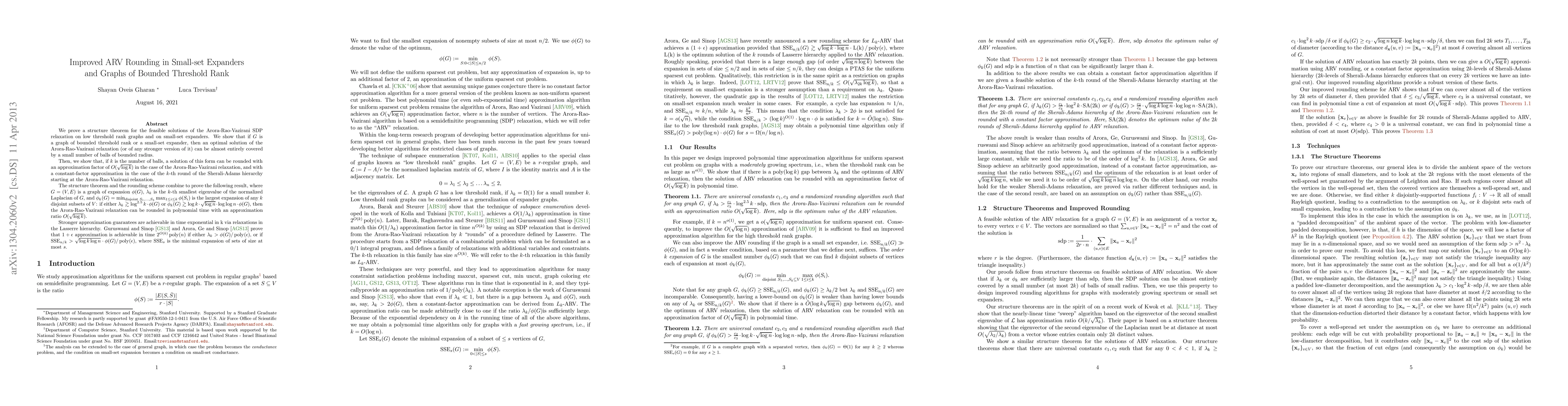 We prove a structure theorem for the feasible solutions of the Arora-Rao-Vazirani SDP relaxation on low threshold rank graphs and on small-set expanders. We show that if G is a graph of bounded threshold rank or a small-set expander, then an optimal solution of the Arora-Rao-Vazirani relaxation (or of any stronger version of it) can be almost entirely covered by a small number of balls of bounded radius. Then, we show that, if k is the number of balls, a solution of this form can be rounded with an approximation factor of O(sqrt {log k}) in the case of the Arora-Rao-Vazirani relaxation, and with a constant-factor approximation in the case of the k-th round of the Sherali-Adams hierarchy starting at the Arora-Rao-Vazirani relaxation. The structure theorem and the rounding scheme combine to prove the following result, where G=(V,E) is a graph of expansion \phi(G), \lambda_k is the k-th smallest eigenvalue of the normalized Laplacian of G, and \phi_k(G) = \min_{disjoint S_1,...,S_k} \max_{1 <= i <= k} \phi(S_i) is the largest expansion of any k disjoint subsets of V: if either \lambda_k >> log^{2.5} k \cdot phi(G) or \phi_{k} (G) >> log k \cdot sqrt{log n}\cdot loglog n\cdot \phi(G), then the Arora-Rao-Vazirani relaxation can be rounded in polynomial time with an approximation ratio O(sqrt{log k}). Stronger approximation guarantees are achievable in time exponential in k via relaxations in the Lasserre hierarchy. Guruswami and Sinop [GS13] and Arora, Ge and Sinop [AGS13] prove that 1+eps approximation is achievable in time 2^{O(k)} poly(n) if either \lambda_k > \phi(G)/ poly(eps), or if SSE_{n/k} > sqrt{log k log n} \cdot \phi(G)/ poly(eps), where SSE_s is the minimal expansion of sets of size at most s.