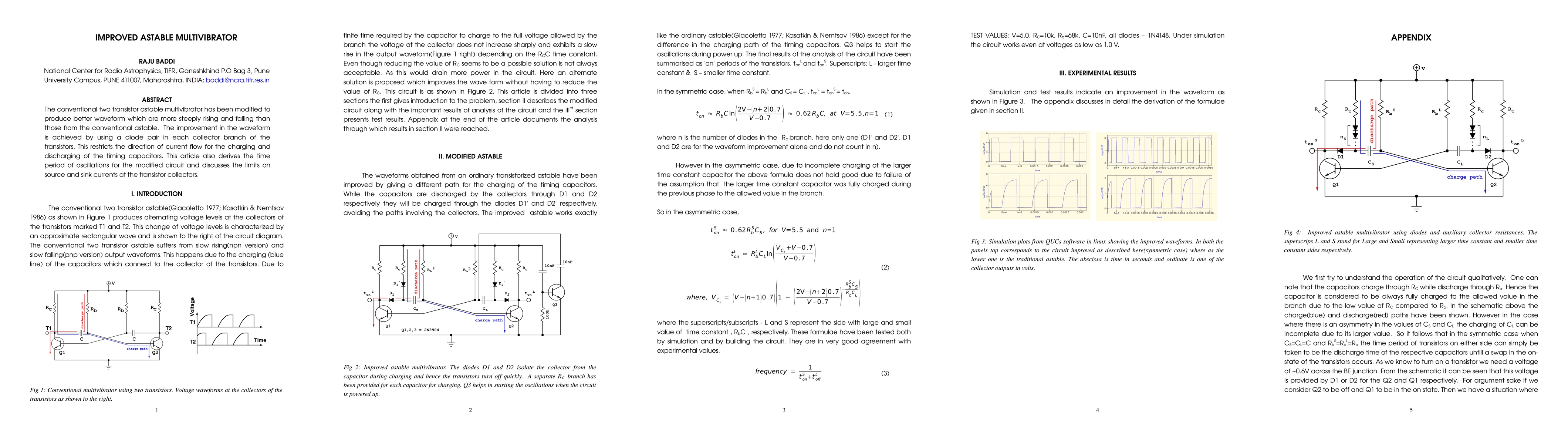 The conventional two transistor astable multivibrator has been modified to produce better waveform which are more steeply rising and falling than those from the conventional astable. The improvement in the waveform is achieved by using a diode pair in each collector branch of the transistors. This restricts the direction of current flow for the charging and discharging of the timing capacitors. This article also derives the time period of oscillations for the modified circuit and discusses the limits on source and sink currents at the transistor collectors.