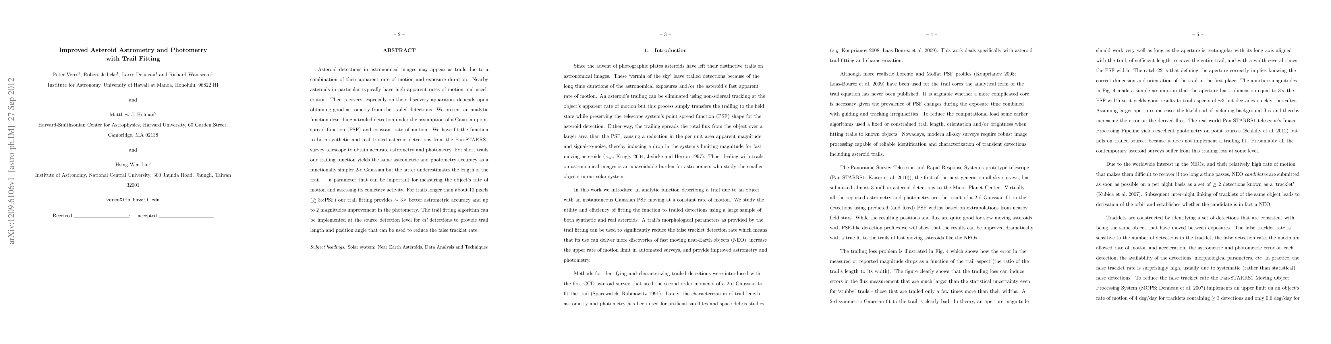 This paper presents an analytic function for modeling trailed asteroid detections in astronomical images, achieving improved astrometry and photometry compared to simpler methods. The trail fitting technique provides significantly better accuracy for longer trails, enhancing the measurement of asteroid motion and activity.
