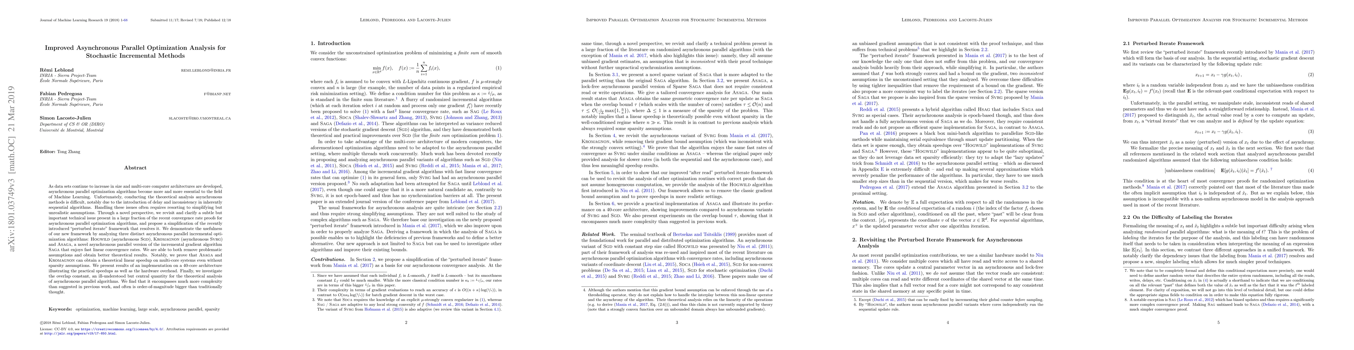 As datasets continue to increase in size and multi-core computer architectures are developed, asynchronous parallel optimization algorithms become more and more essential to the field of Machine Learning. Unfortunately, conducting the theoretical analysis asynchronous methods is difficult, notably due to the introduction of delay and inconsistency in inherently sequential algorithms. Handling these issues often requires resorting to simplifying but unrealistic assumptions. Through a novel perspective, we revisit and clarify a subtle but important technical issue present in a large fraction of the recent convergence rate proofs for asynchronous parallel optimization algorithms, and propose a simplification of the recently introduced "perturbed iterate" framework that resolves it. We demonstrate the usefulness of our new framework by analyzing three distinct asynchronous parallel incremental optimization algorithms: Hogwild (asynchronous SGD), KROMAGNON (asynchronous SVRG) and ASAGA, a novel asynchronous parallel version of the incremental gradient algorithm SAGA that enjoys fast linear convergence rates. We are able to both remove problematic assumptions and obtain better theoretical results. Notably, we prove that ASAGA and KROMAGNON can obtain a theoretical linear speedup on multi-core systems even without sparsity assumptions. We present results of an implementation on a 40-core architecture illustrating the practical speedups as well as the hardware overhead. Finally, we investigate the overlap constant, an ill-understood but central quantity for the theoretical analysis of asynchronous parallel algorithms. We find that it encompasses much more complexity than suggested in previous work, and often is order-of-magnitude bigger than traditionally thought.
