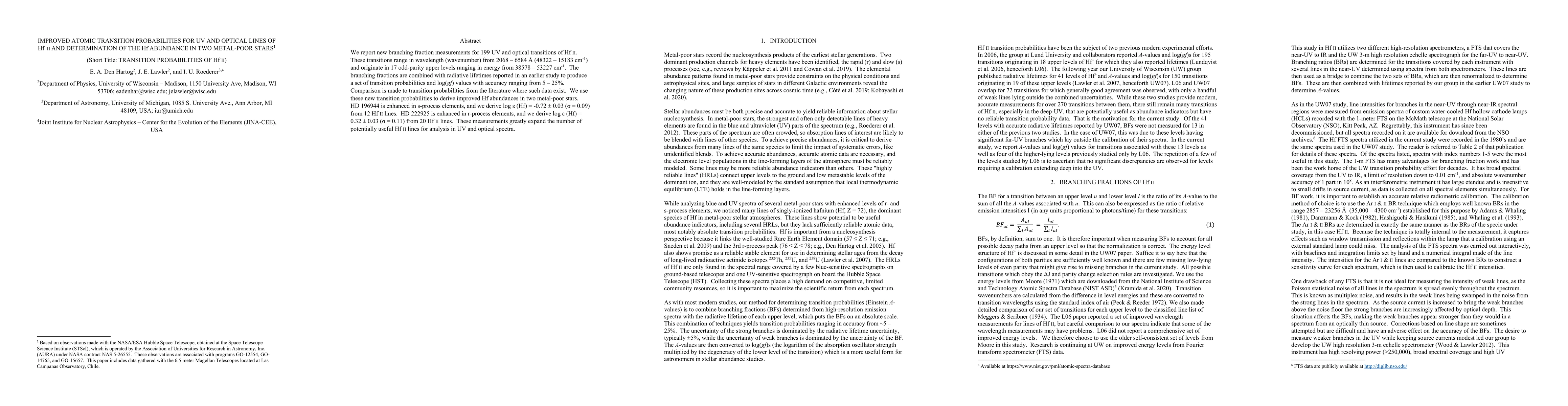 This paper presents new branching fraction measurements for 199 UV and optical transitions of Hf II, improving transition probabilities and log(gf) values. The enhanced Hf abundances in two metal-poor stars, HD 196944 and HD 222925, are derived using these refined probabilities, providing valuable data for stellar nucleosynthesis studies.