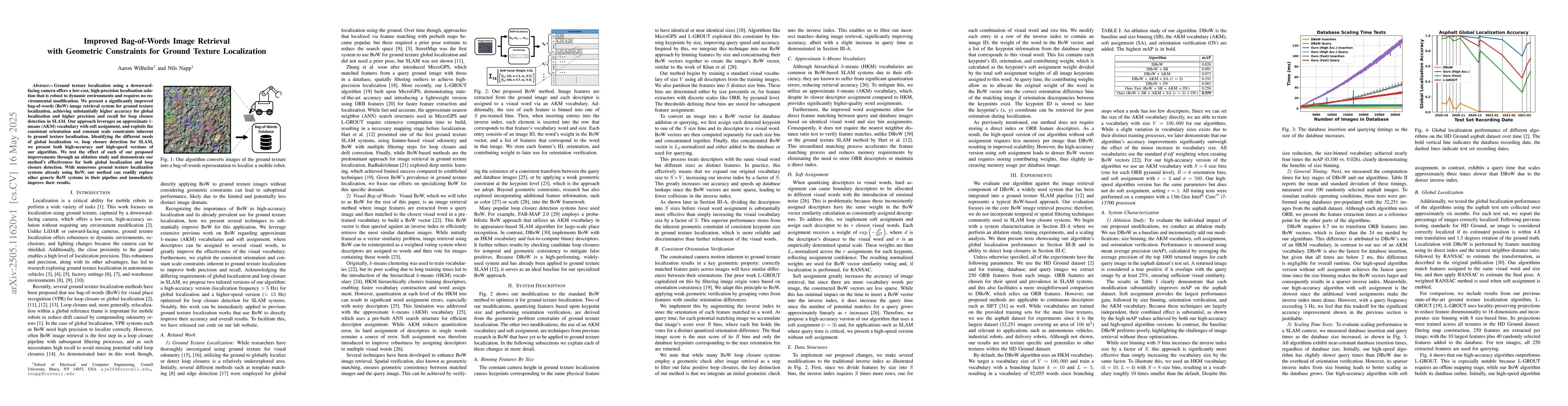 The research presents an improved bag-of-words (BoW) image retrieval system for ground texture localization using an approximate k-means (AKM) vocabulary with soft assignment, exploiting consistent orientation and constant scale constraints inherent to ground texture localization. It offers both high-accuracy and high-speed versions of the algorithm tailored for global localization and loop closure detection in SLAM, respectively.