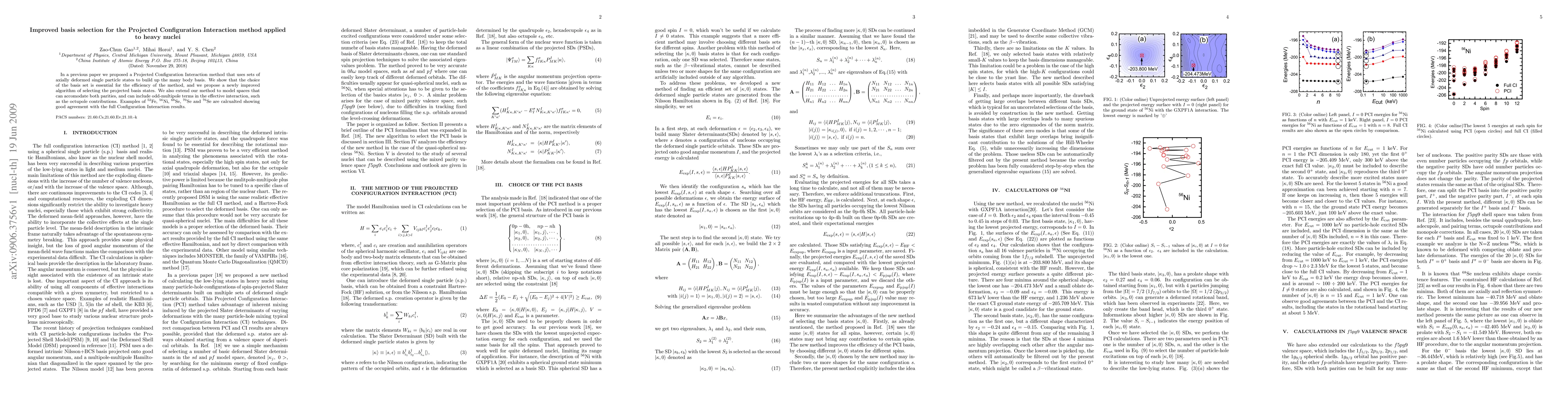 This paper proposes an improved algorithm for selecting the basis states in the Projected Configuration Interaction (PCI) method for heavy nuclei, emphasizing the importance of basis set choice for efficiency. The new algorithm extends the method to include both parities and odd-multipole terms, such as octupole contributions, and demonstrates its effectiveness through calculations on isotopes of Fe, Ni, Se, showing good agreement with full Configuration Interaction results.