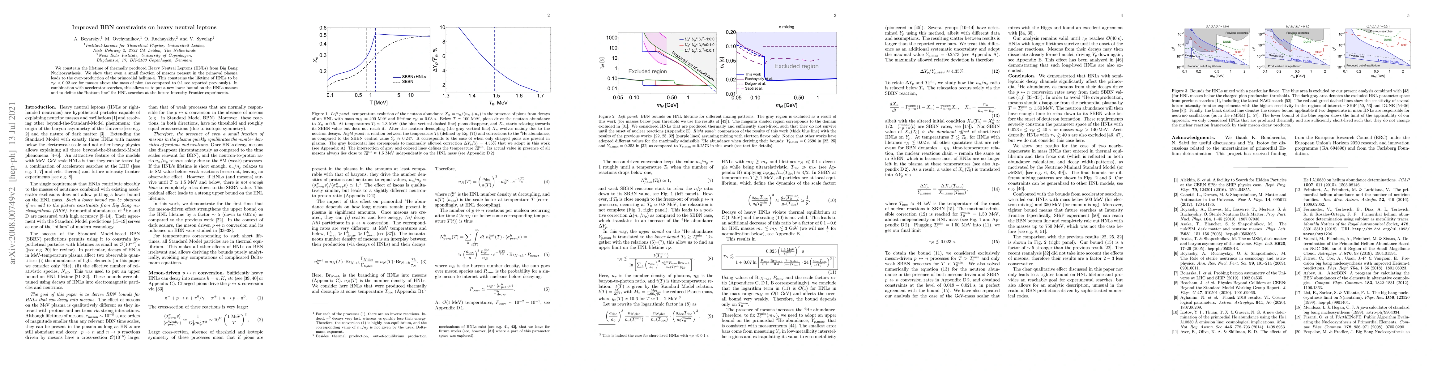 This paper refines constraints on the lifetime of Heavy Neutral Leptons (HNLs) from primordial nucleosynthesis, showing that a small fraction of mesons in the primordial plasma can over-produce helium, leading to a stricter upper limit of $\tau_{N}<0.02$ s for HNLs with masses $m_{N}>m_{\pi}$. Combined with accelerator searches, this tightens the lower bound on HNL masses and sets a new benchmark for future experiments.