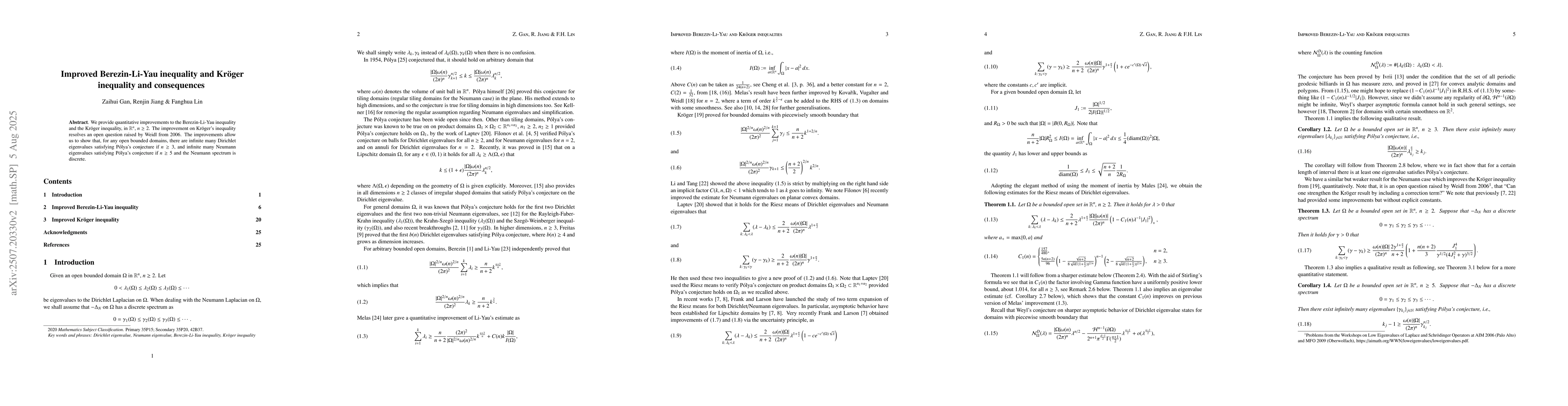 We provide quantitative improvements to the Berezin-Li-Yau inequality and the Kr\"oger inequality, in $\mathbb{R}^n$, $n\ge 2$. The improvement on Kr\"oger's inequality resolves an open question raised by Weidl from 2006. The improvements allow us to show that, for any open bounded domains, there are infinite many Dirichlet eigenvalues satisfying P\'olya's conjecture if $n\ge 3$, and infinite many Neumann eigenvalues satisfying P\'olya's conjecture if $n\ge 5$ and the Neumann spectrum is discrete.