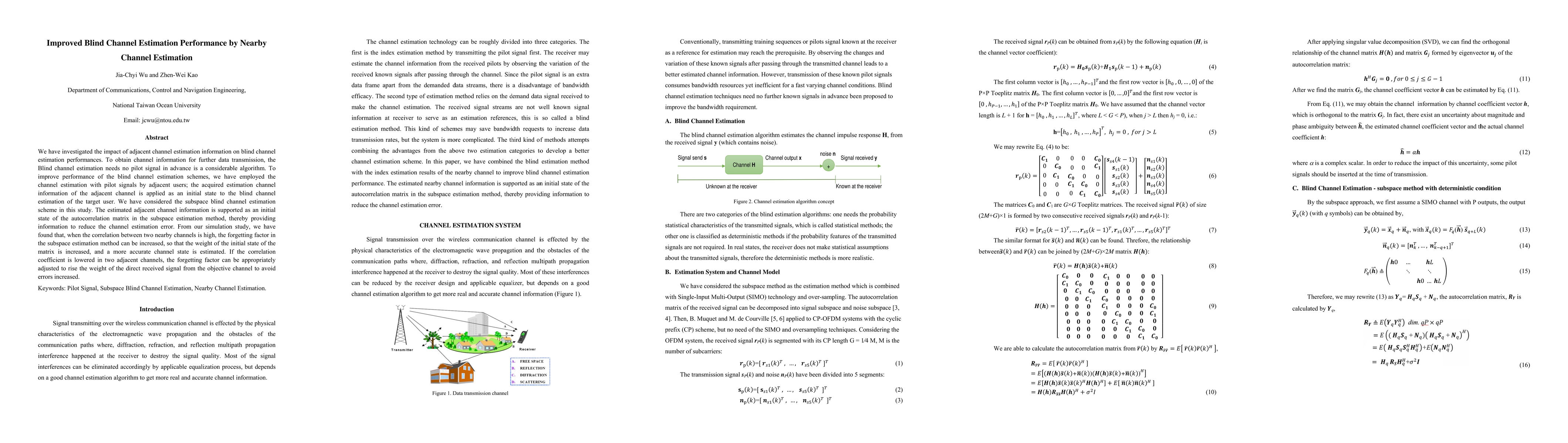 Using nearby channel estimation, researchers improved blind channel estimation performance by using adjacent users' channel information as an initial state for target user's blind channel estimation. High correlation between channels allows increased forgetting factor, leading to more accurate channel estimates.