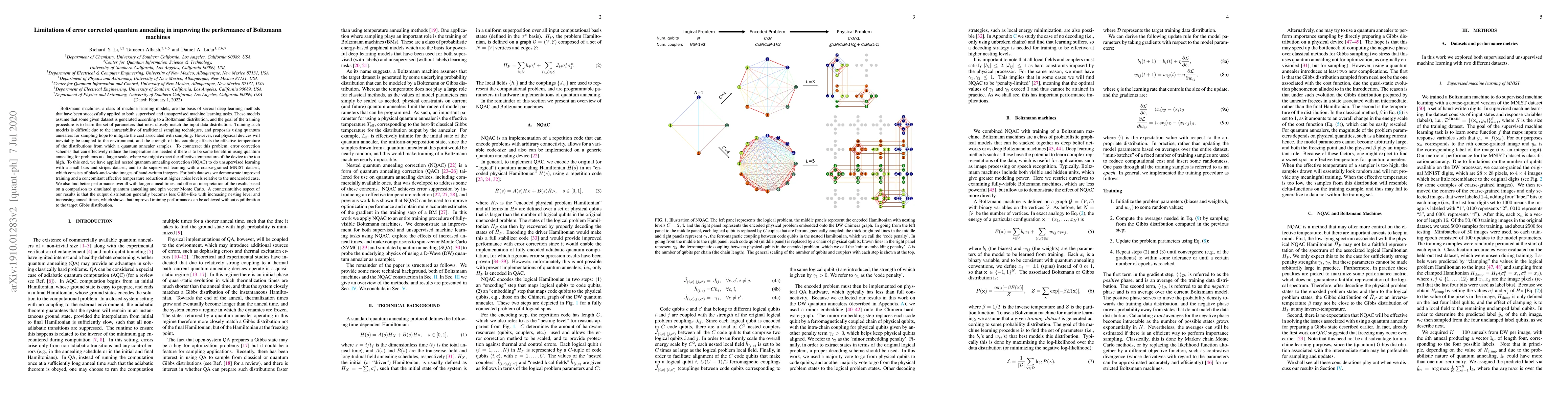This paper explores the use of nested quantum annealing correction (NQAC) to improve Boltzmann machines for machine learning tasks, demonstrating enhanced training performance and effective temperature reduction on both small and MNIST datasets. The study finds that improved training can occur without equilibration to the target Gibbs distribution, counterintuitively showing less Gibbs-like output with higher nesting levels and longer anneal times.