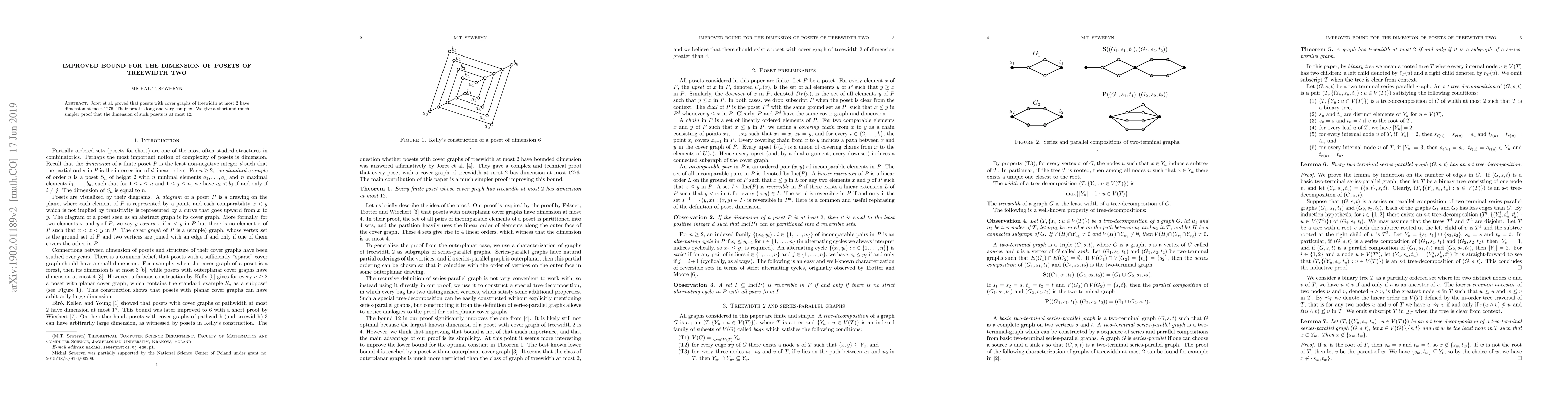 The research improves the upper bound for the dimension of posets with treewidth two, reducing it from 1276 to 12 through a significantly simpler and more straightforward proof compared to previous methods.