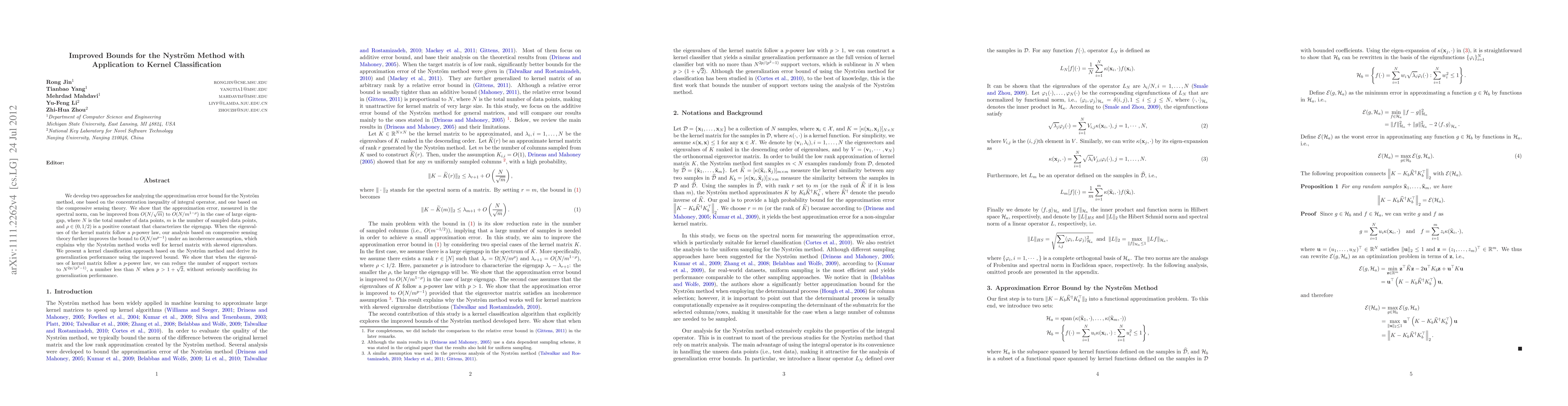 This paper improves the error bound for Nystrom's method, a kernel classification technique, to O(N/m^(1 - rho)) for large eigengap and O(N/m^p-1) under compressive sensing theory for skewed eigenvalues, allowing for more efficient support vector selection.