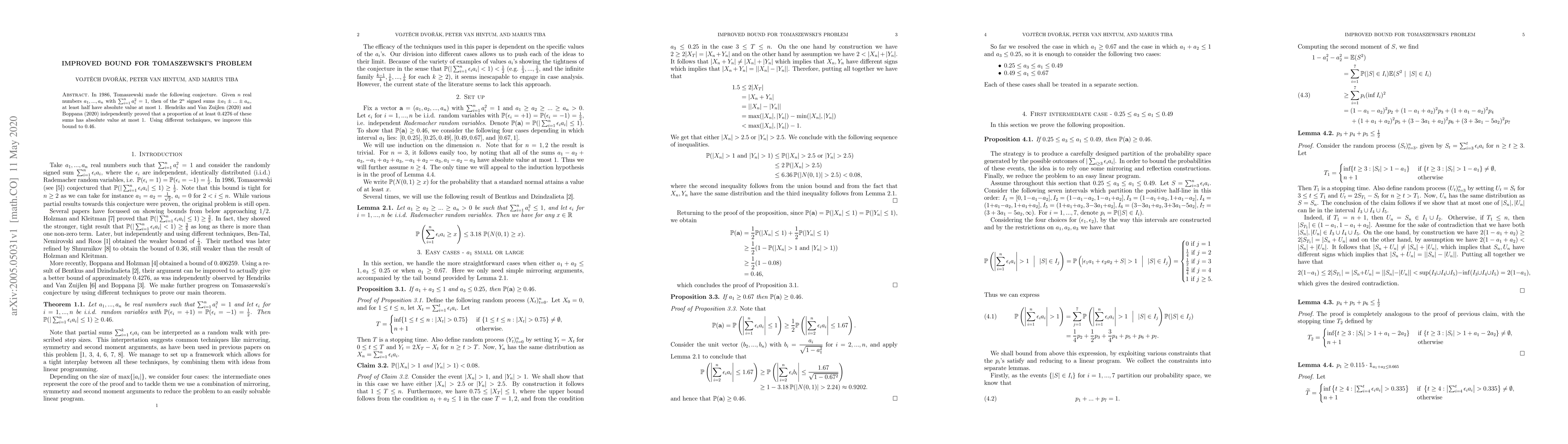 Researchers improved the bound for Tomaszewski's problem to 0.46, showing that at least 46% of signed sums have absolute value at most 1.