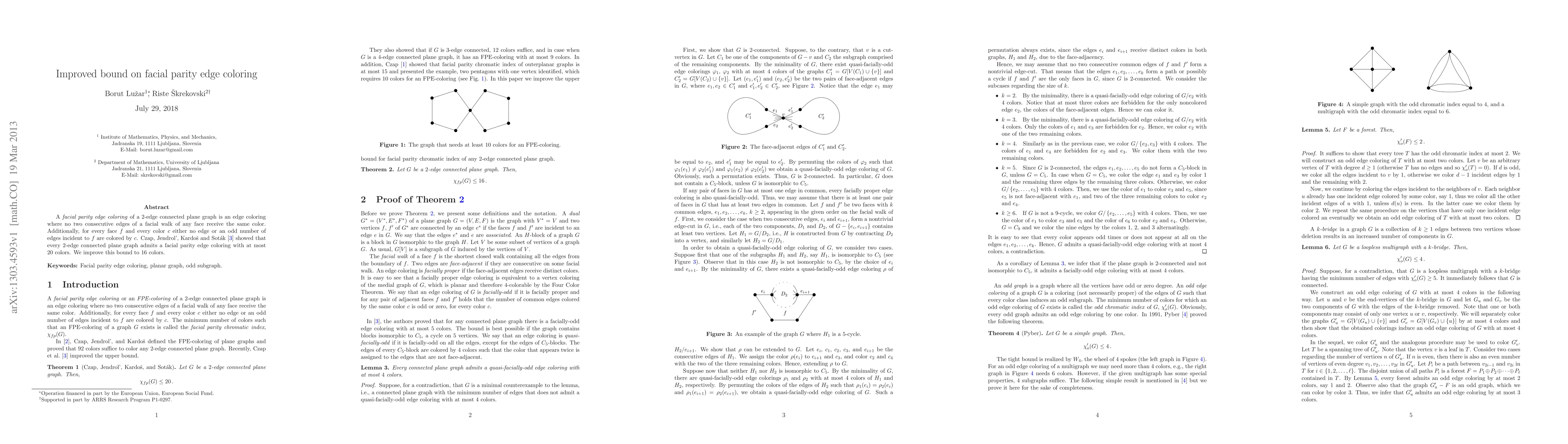 This paper improves the bound on facial parity edge coloring for 2-edge connected plane graphs, reducing the number of required colors from 20 to 16. The authors demonstrate a more efficient coloring method that adheres to the specified parity conditions.